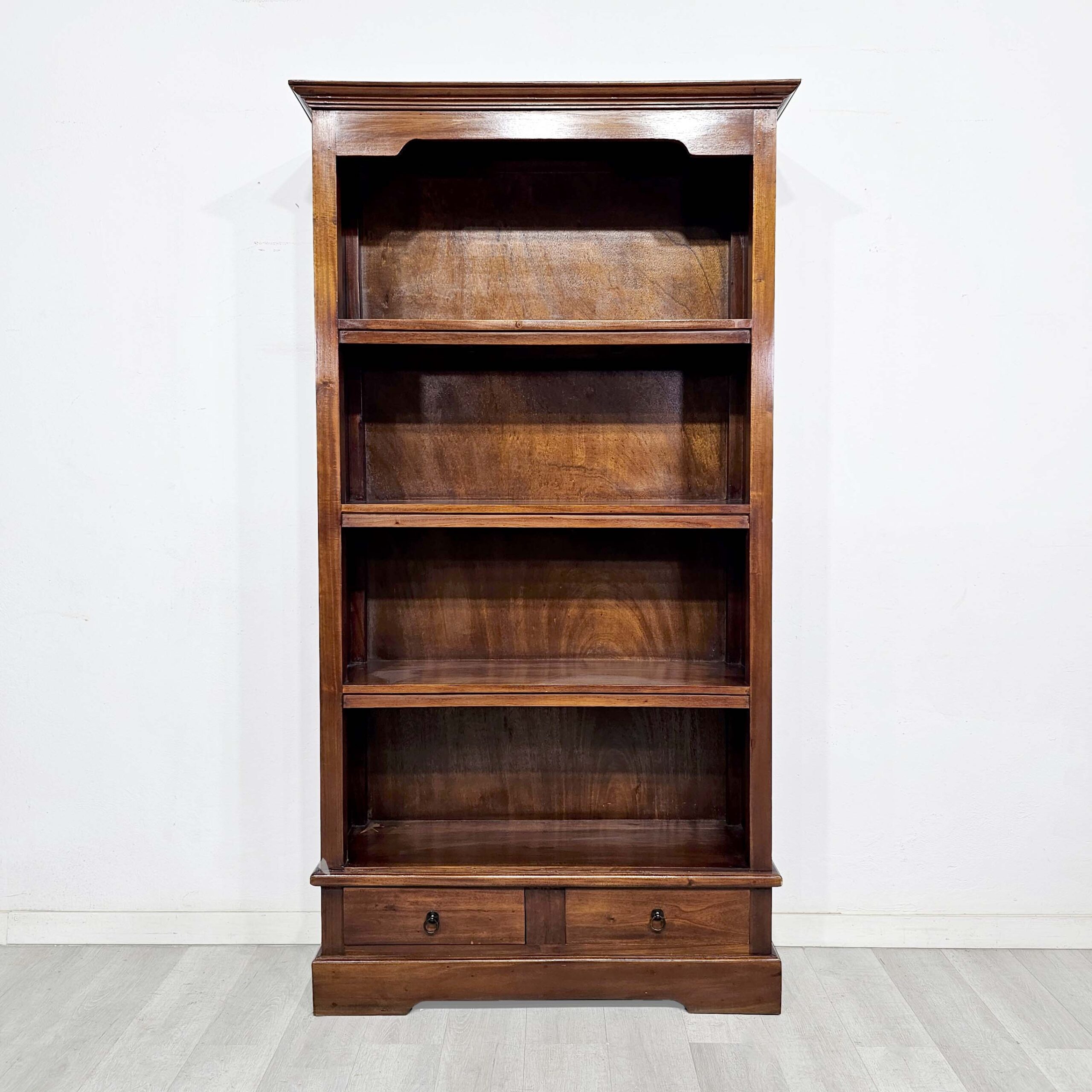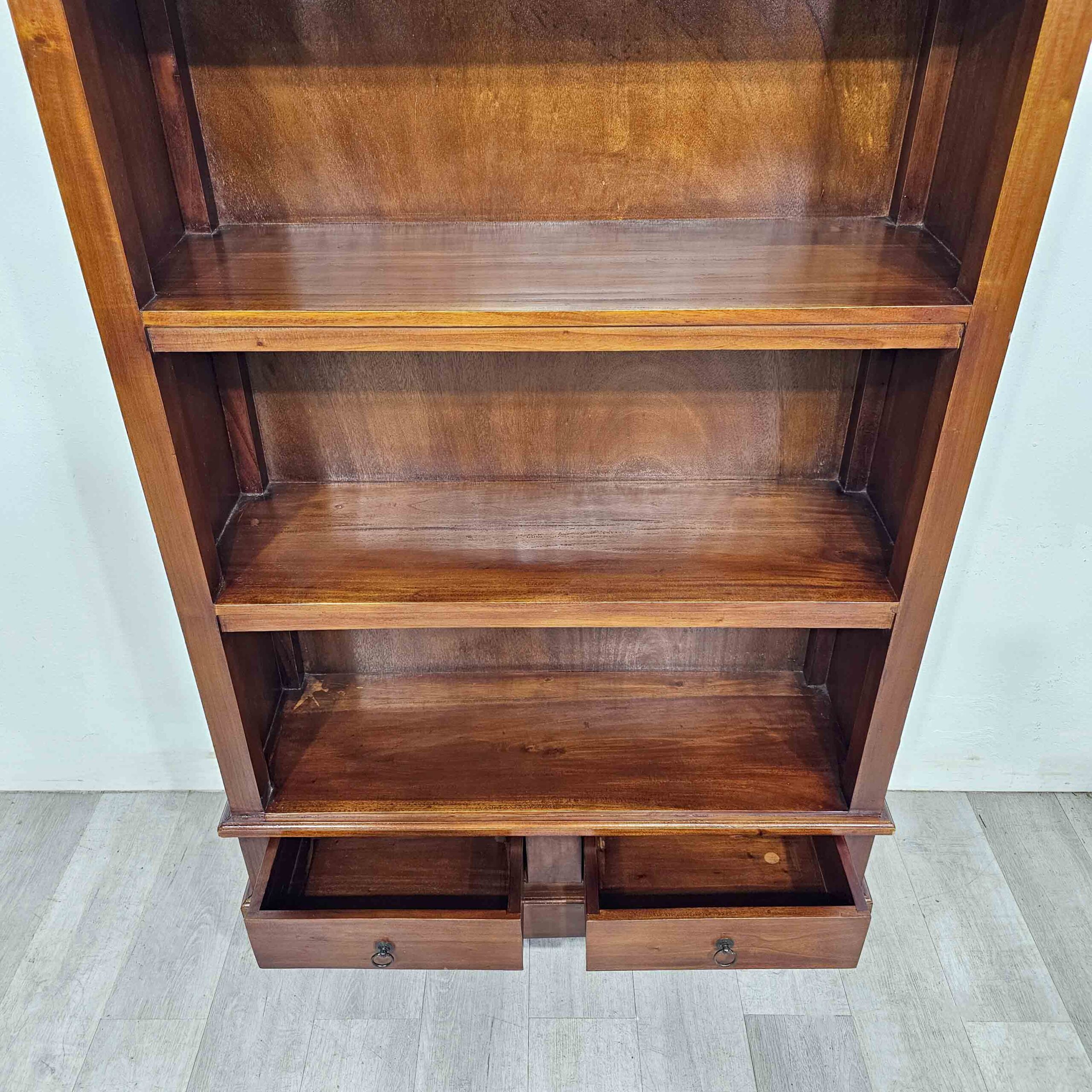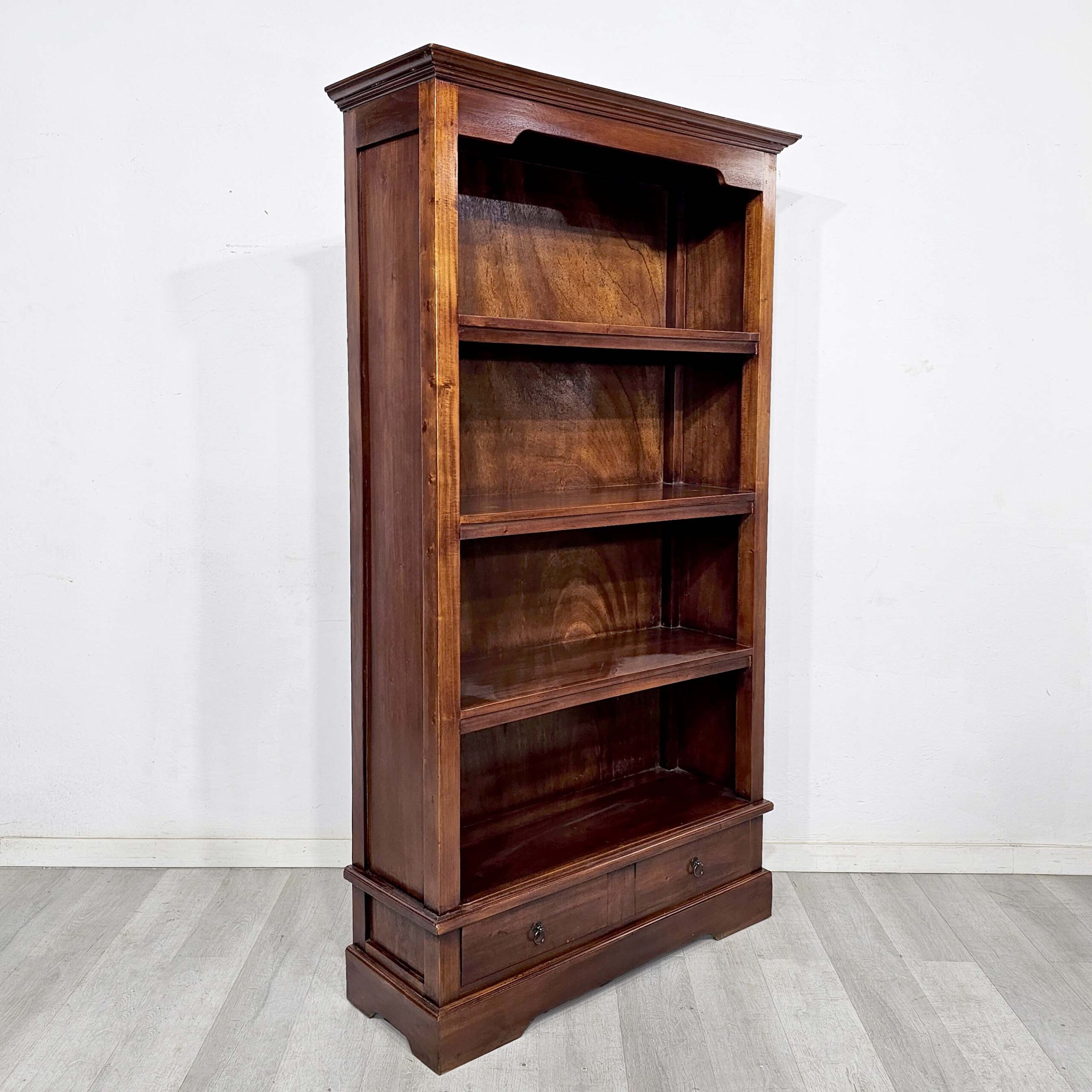 Biblioteca / estantería alta en cedro y enchapado en cedro, estilo clásico, con 3 estantes fijos y 2 cajones inferiores. Ideal para libros, vajilla, objetos decorativos o archivo en living, comedor u oficina.