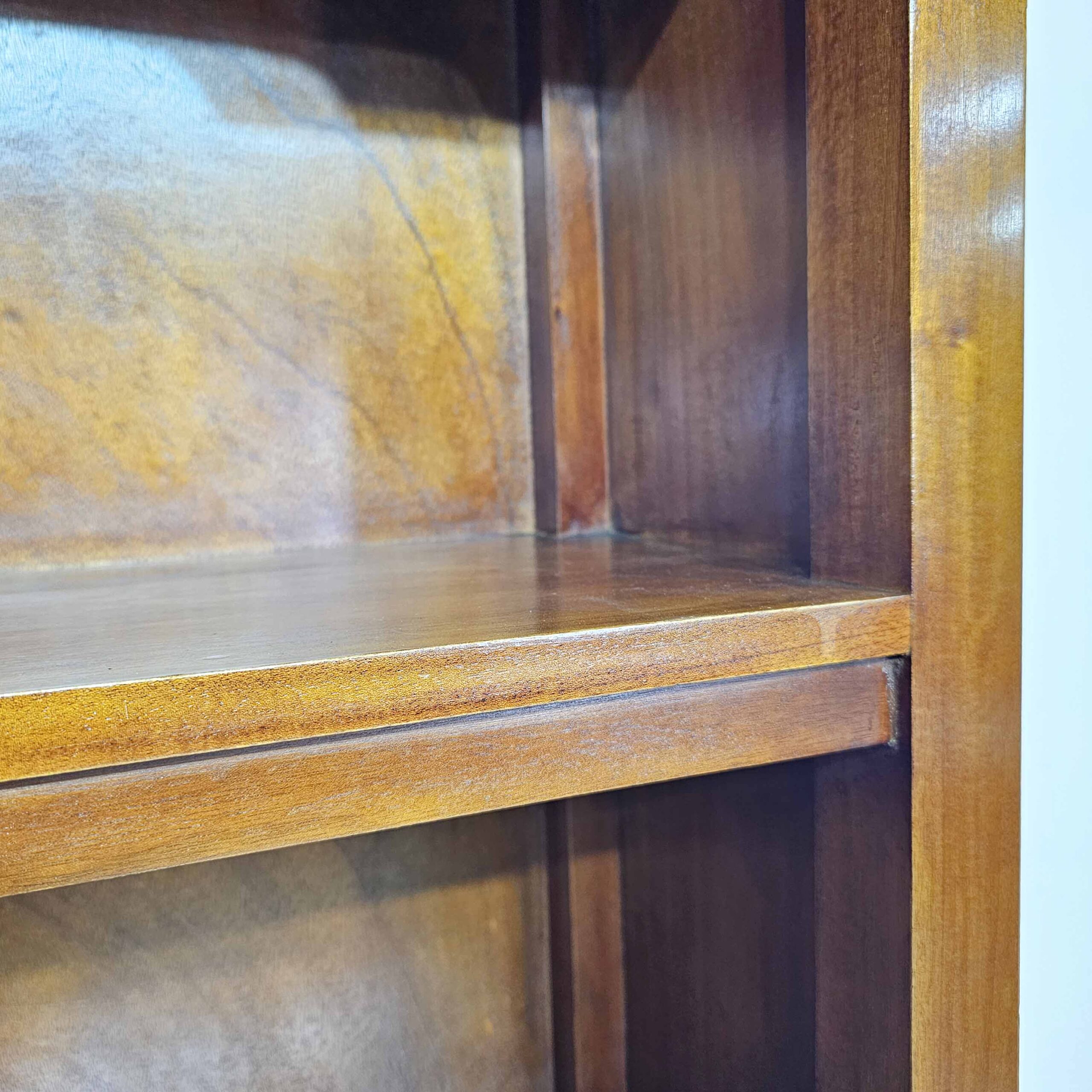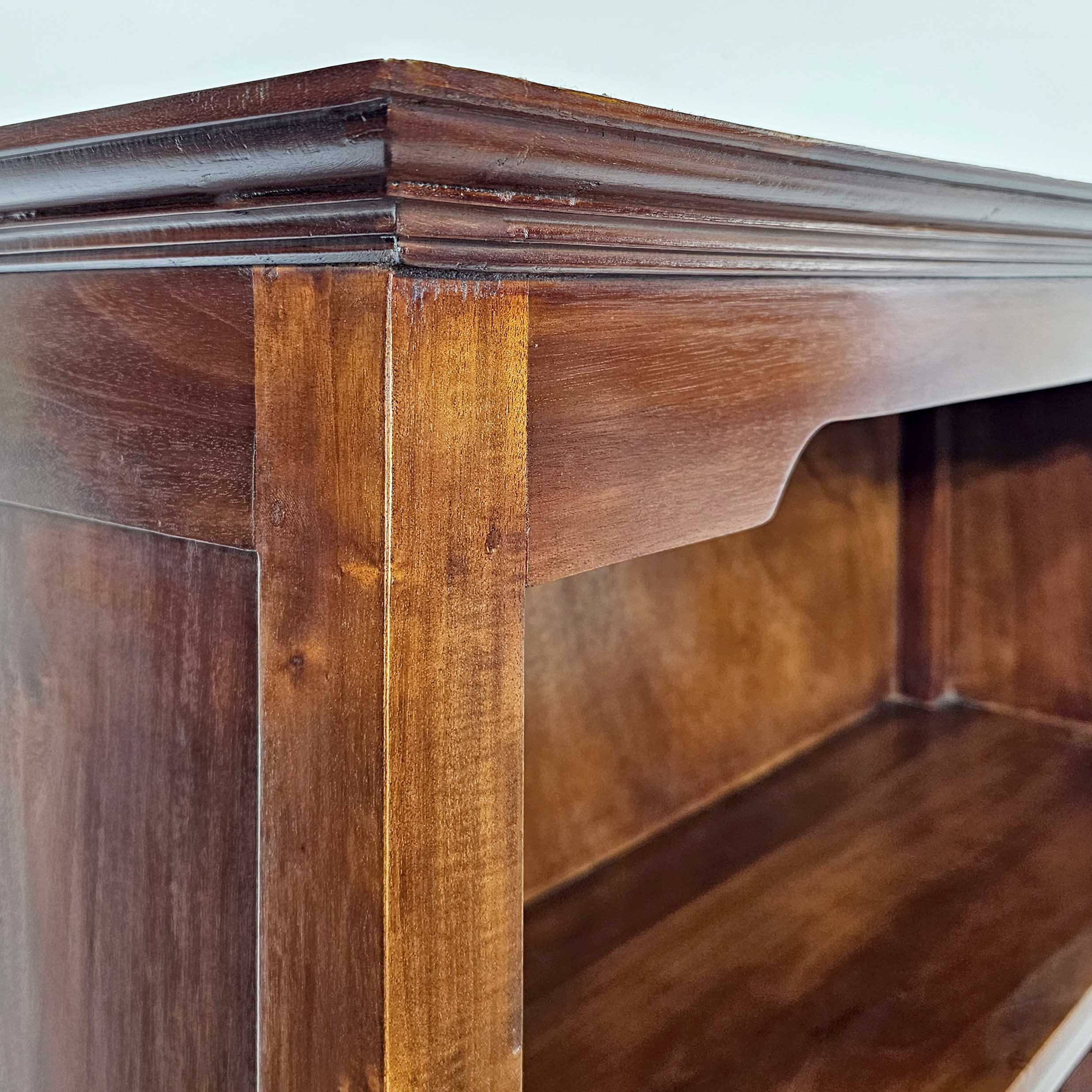 Biblioteca / estantería alta de estilo clásico, realizada en madera de cedro y enchapado en cedro, con terminación lustrada en tono cálido. Presenta un coronamiento superior con moldura, frente con recorte suave y base con zócalo. Cuenta con 3 estantes fijos que generan espacios amplios para libros, vajilla, objetos decorativos o archivo, y 2 cajones inferiores ideales para guardado oculto (papelería, manteles, cables, etc.). Una pieza versátil y robusta, perfecta para living, comedor, estudio u oficina.