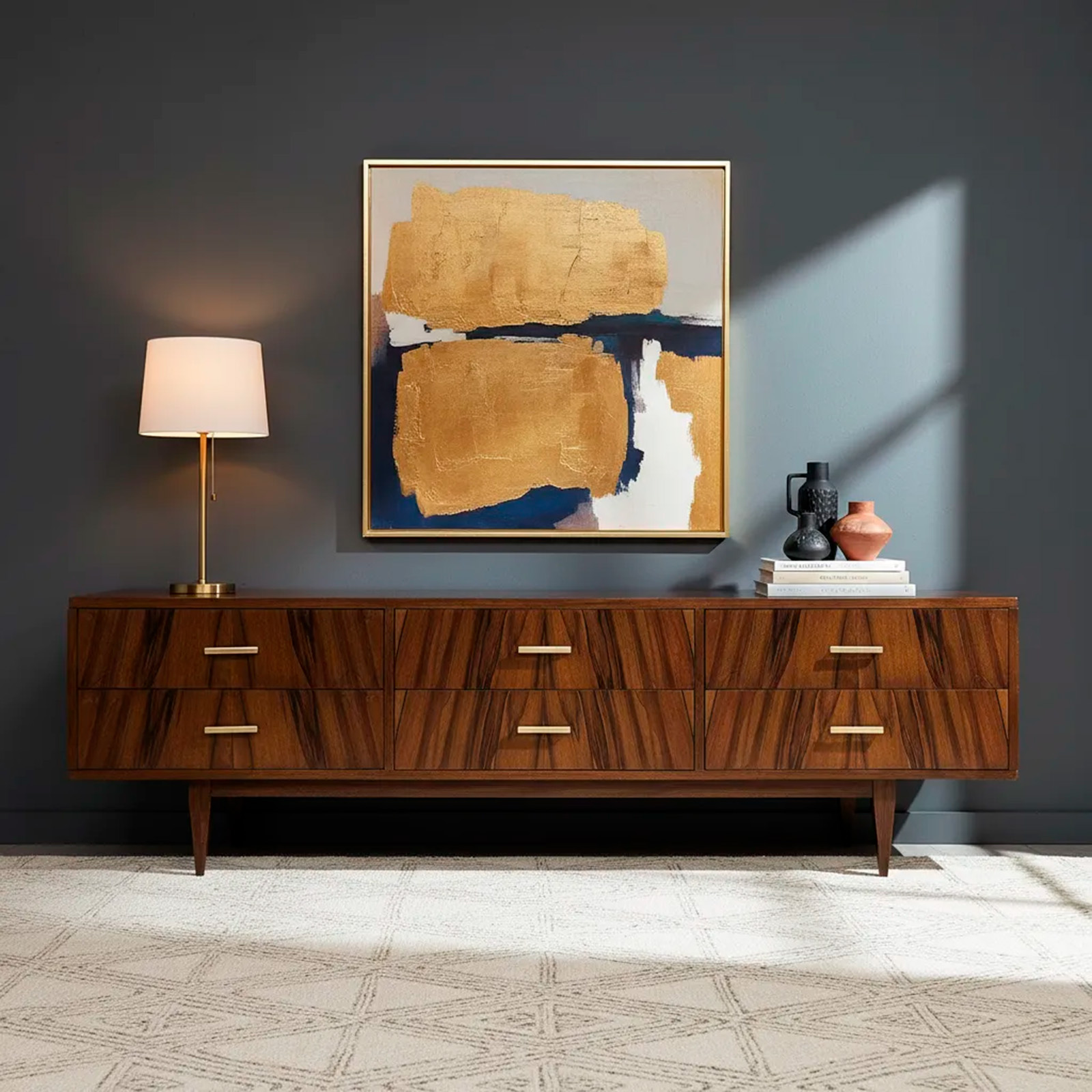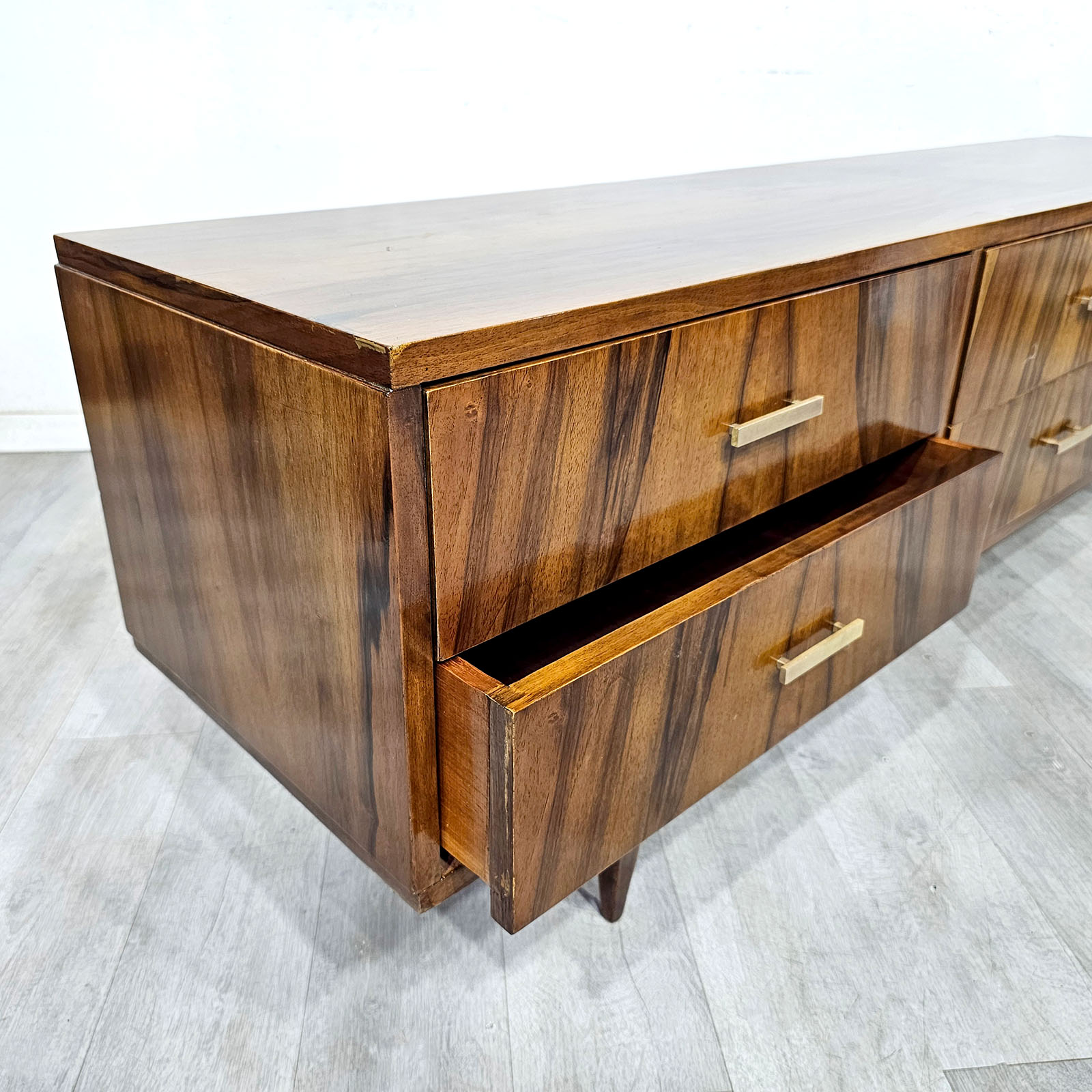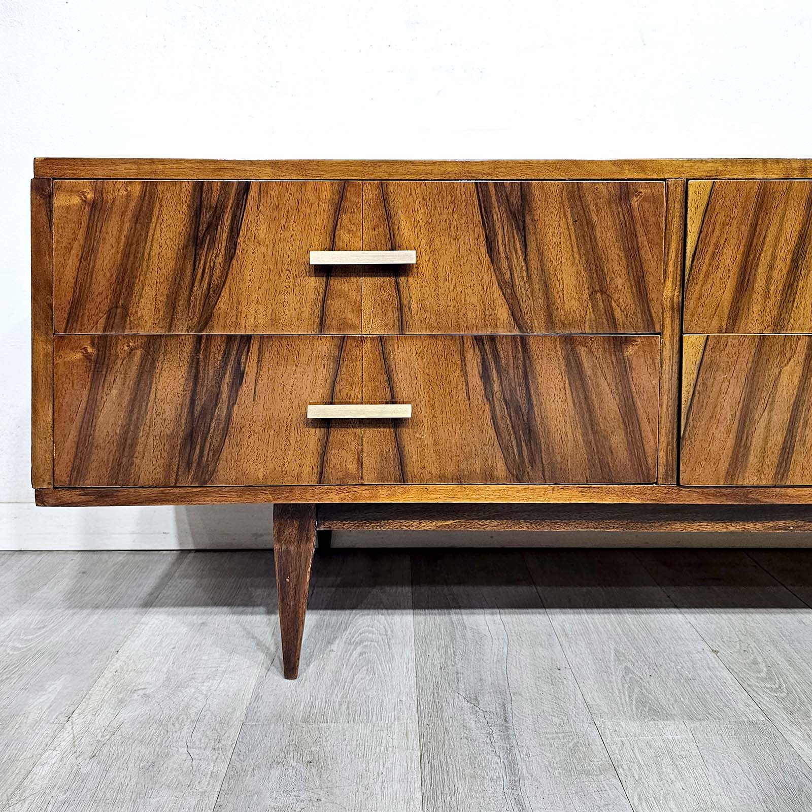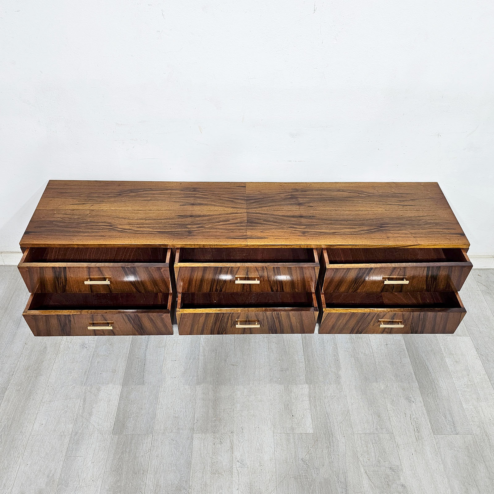 Tiene seis cajones amplios, tiradores de bronce de línea sobria y patas cónicas, típicas del diseño moderno de mediados del siglo XX. El lustre cálido y el contraste natural del nogal la hacen funcionar muy bien tanto en un dormitorio como en living, estudio o espacio de guardado con perfil decorativo.