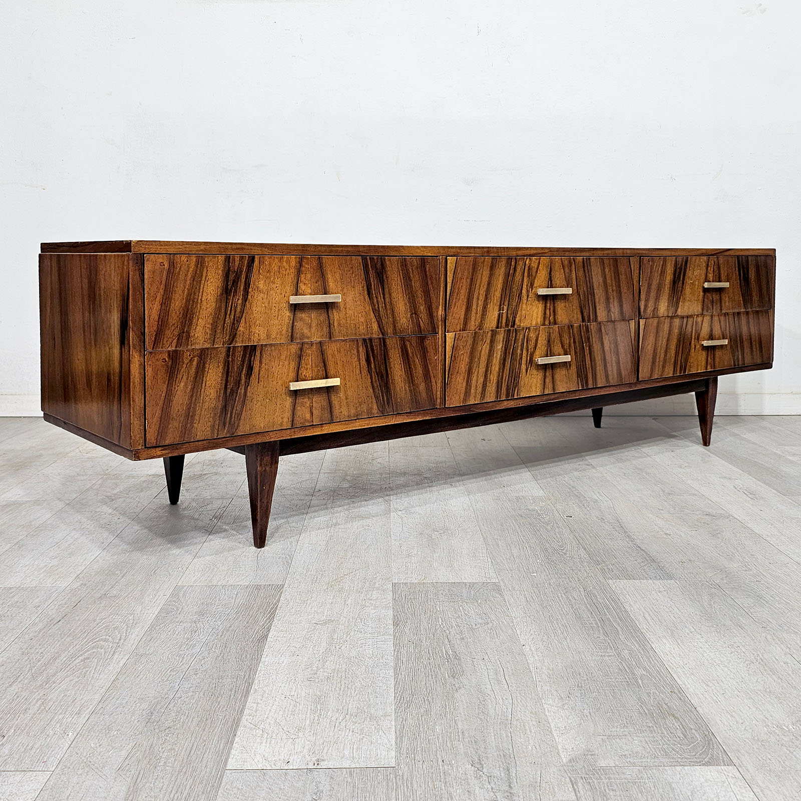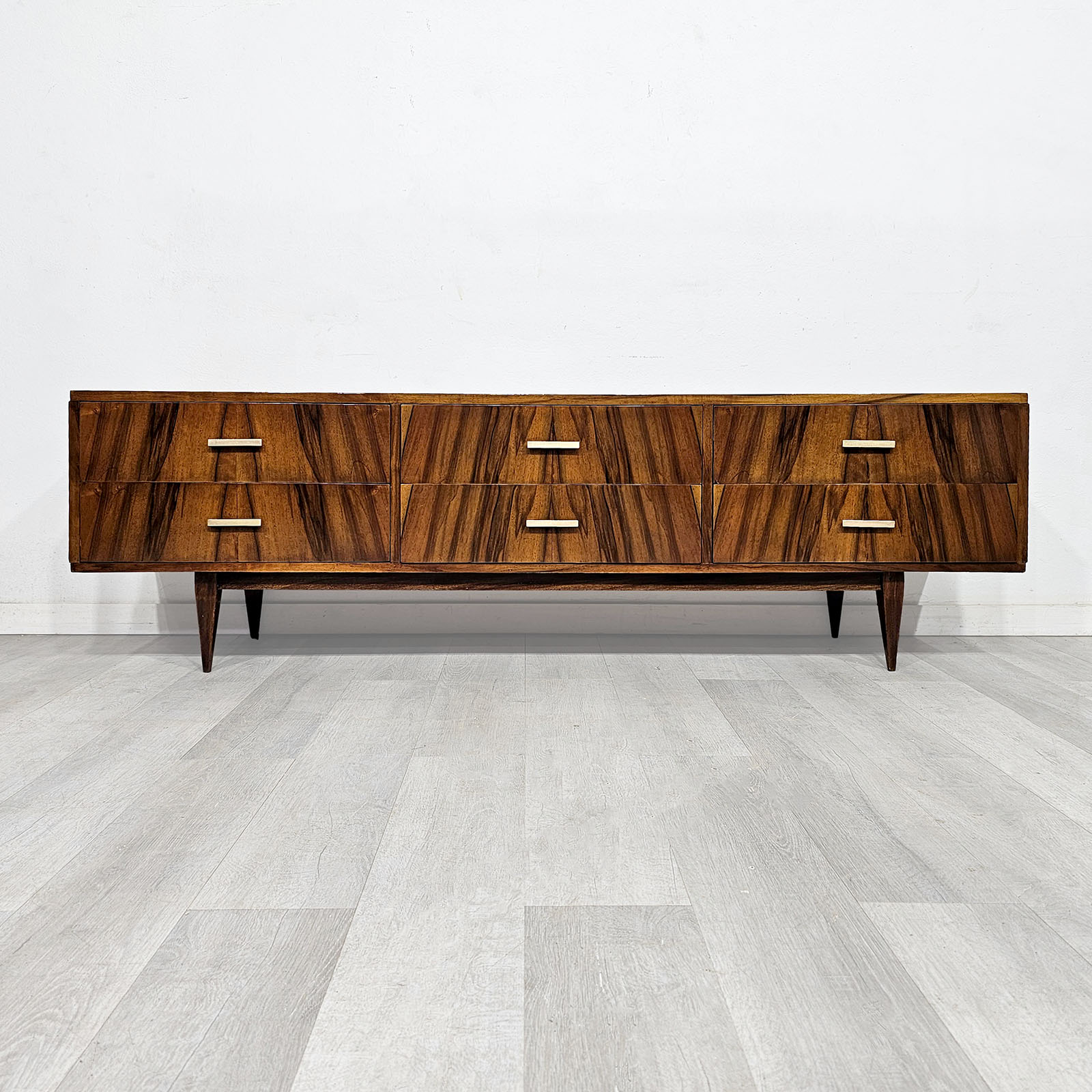Cómoda baja / rack Mid Century realizada en madera enchapada en nogal, con seis cajones, tiradores de bronce y patas cónicas. Se destaca por su frente de veta espejada, líneas limpias y muy buena presencia. Medidas aprox.: 170 x 40 x 45 cm. Alto interior de cajones: 11 cm.