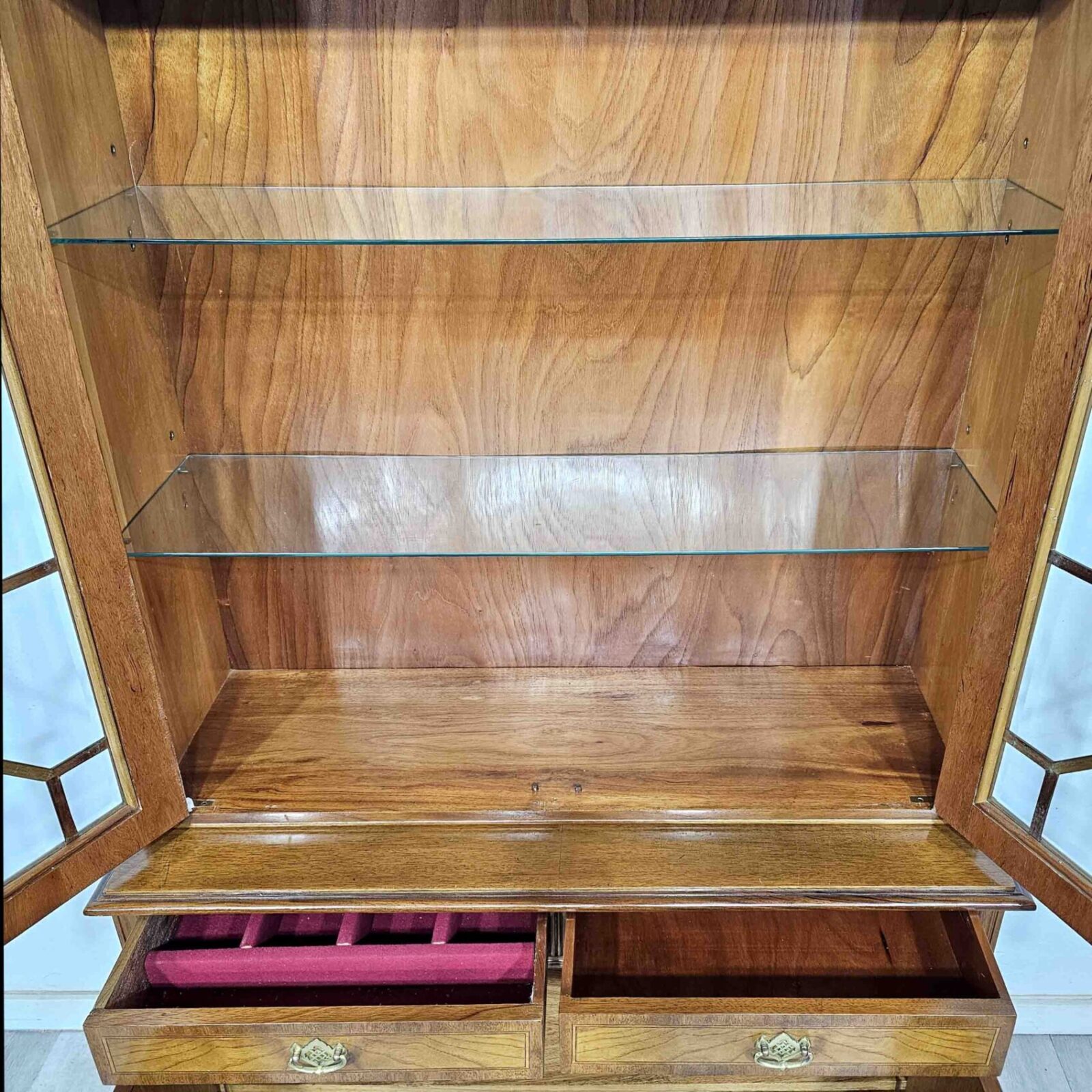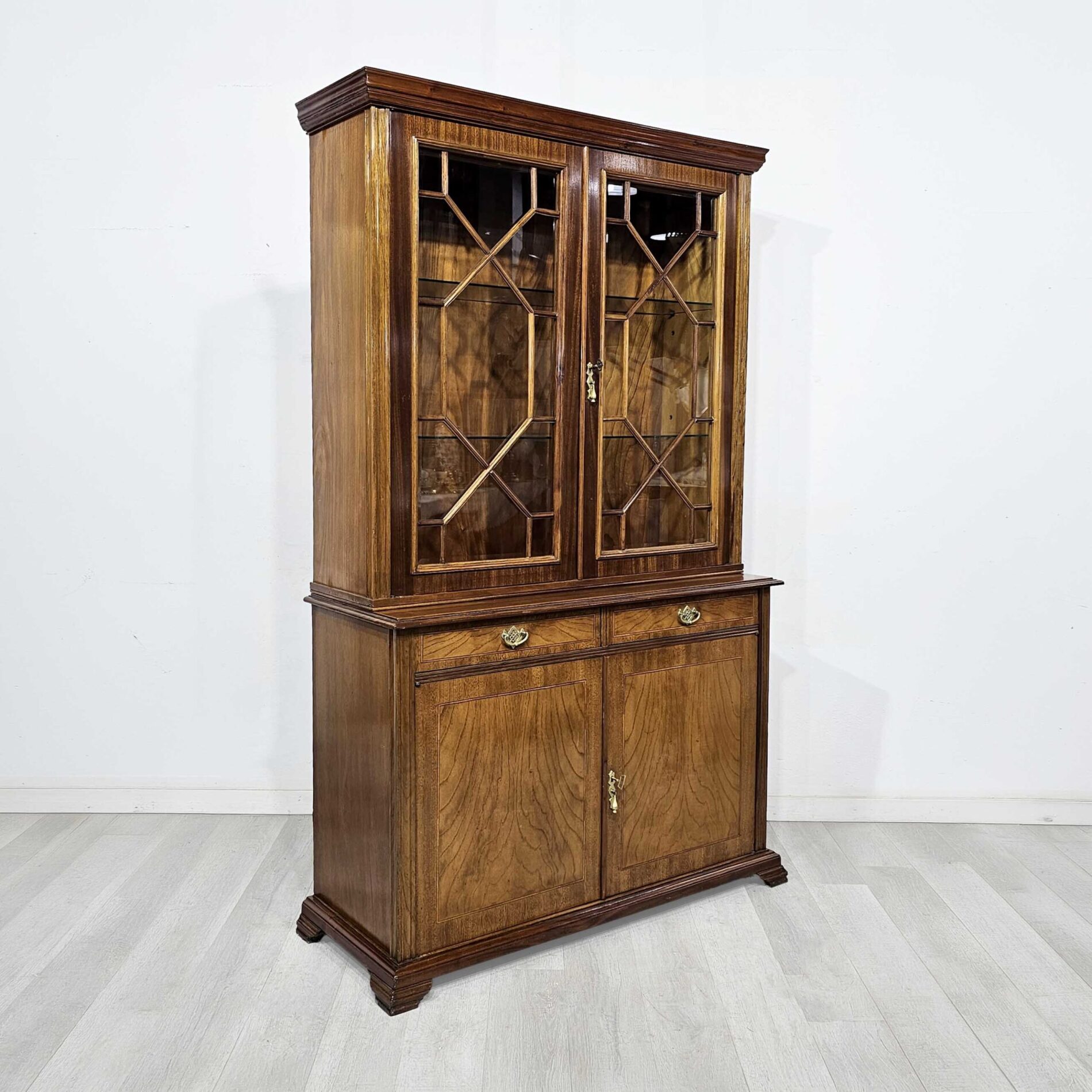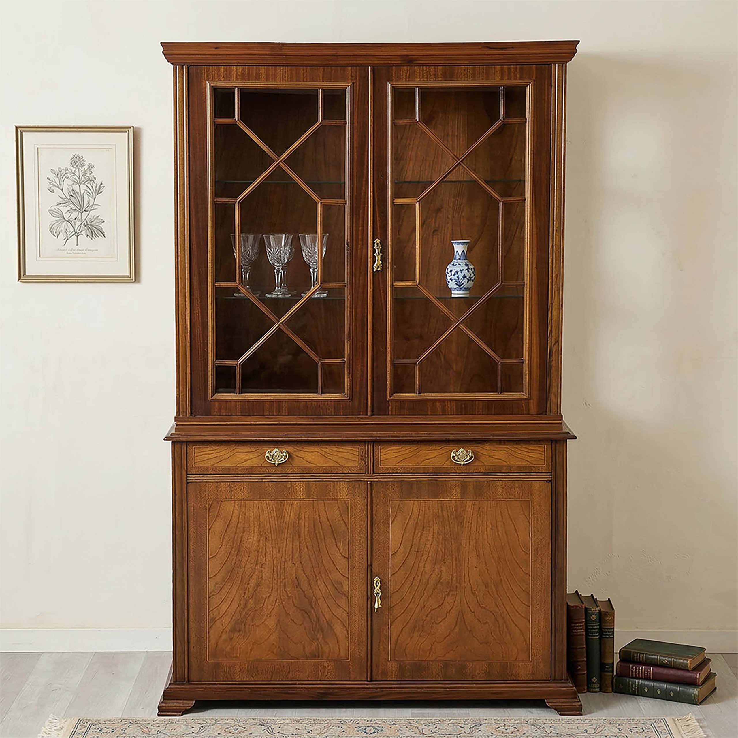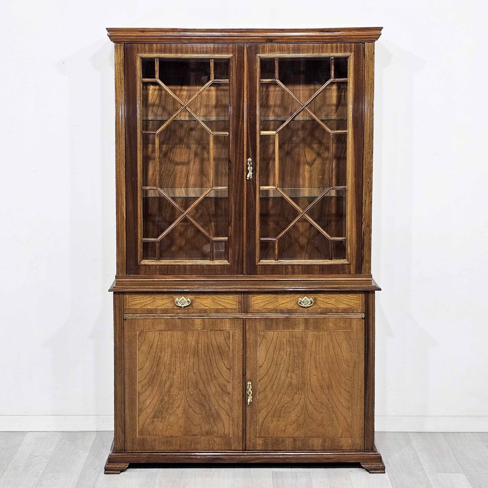 Cristalero / vitrina de estilo inglés, de dos cuerpos desmontables, realizado en madera con enchapados en caoba y pluma de caoba, con puertas superiores vidriadas de diseño geométrico, dos estantes de vidrio, dos cajones y bajo con doble puerta. Una pieza elegante, sobria y muy funcional, ideal tanto para vajilla y cristalería como para libros, objetos decorativos o colección.