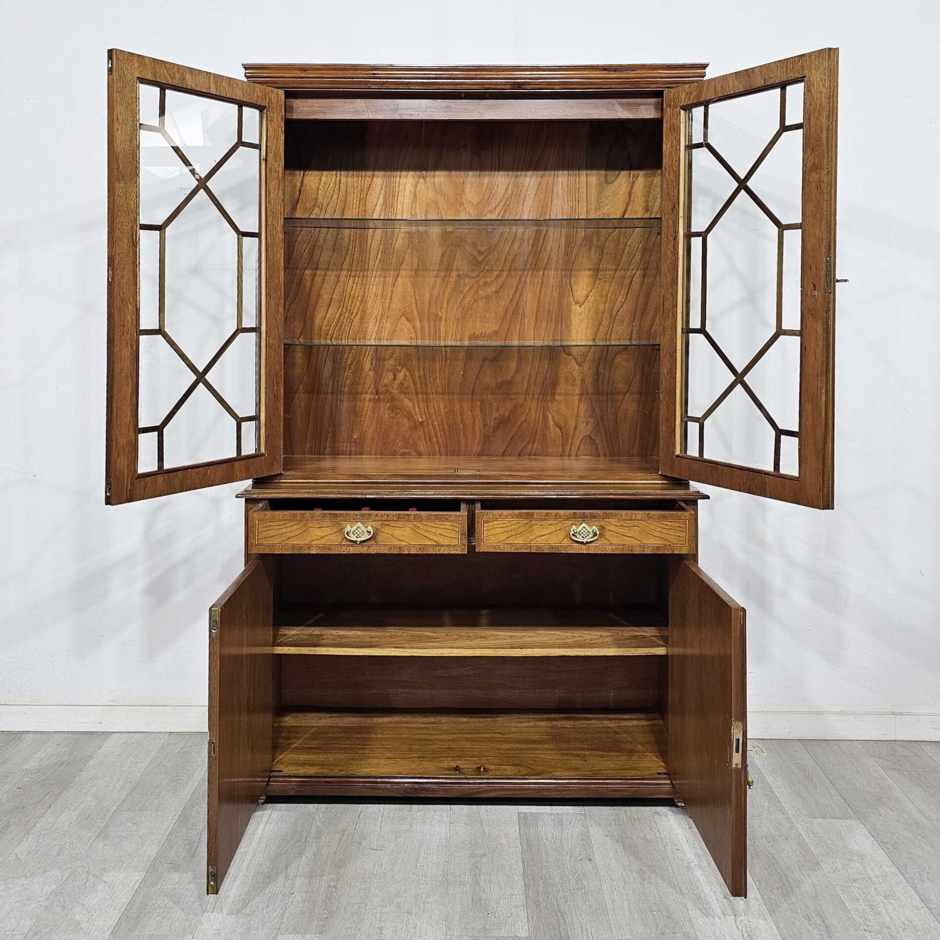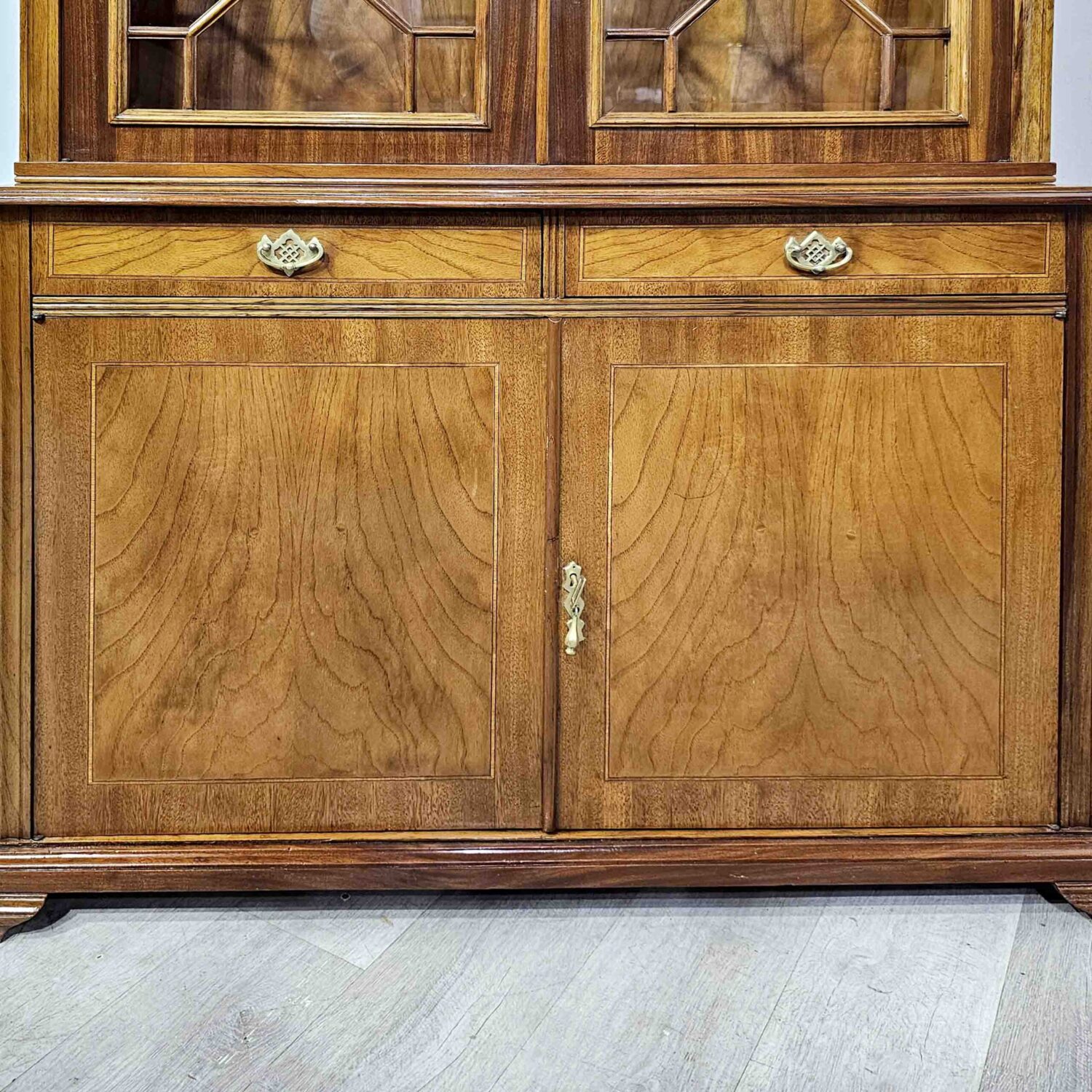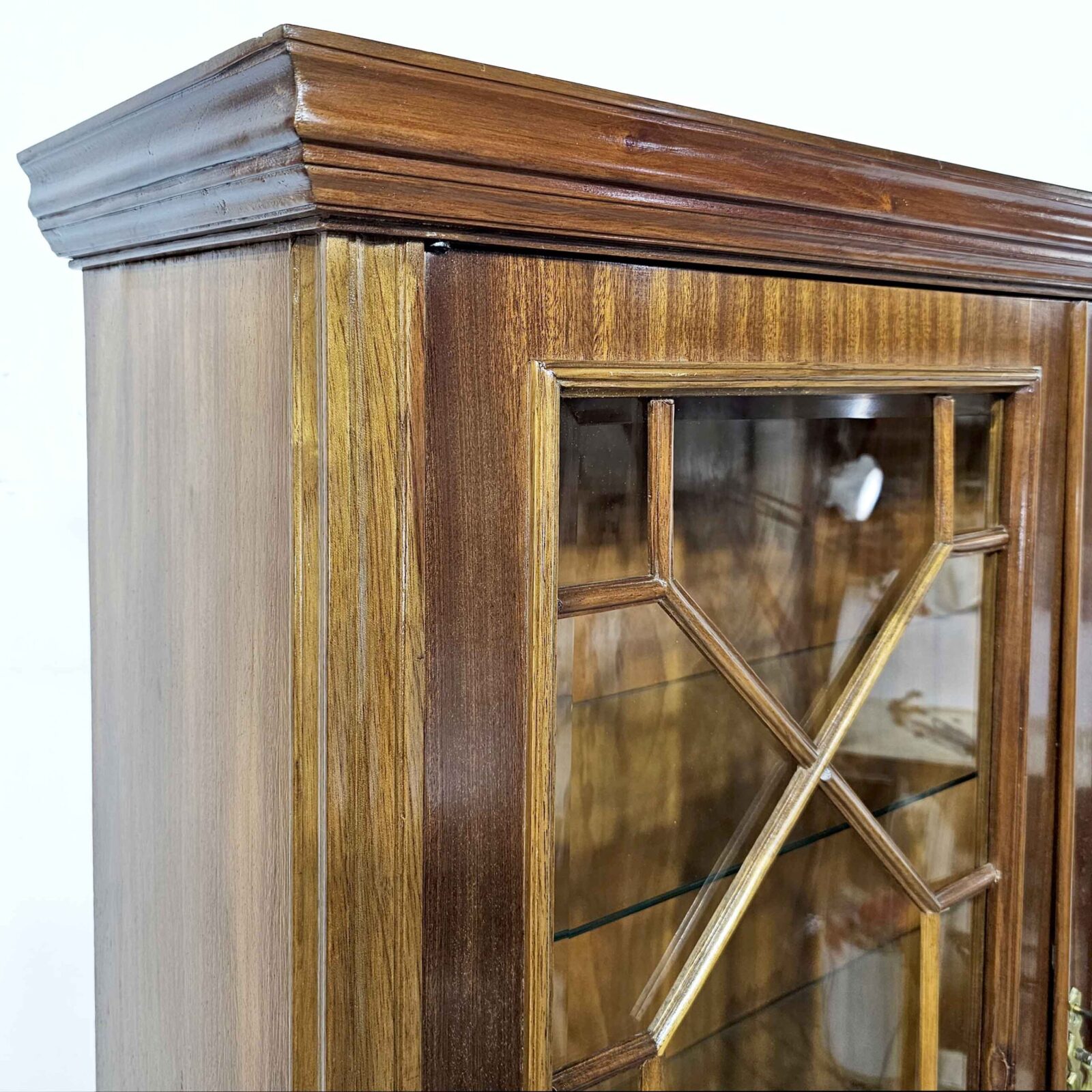 Cristalero de estilo inglés, de dos cuerpos desmontables, realizado en madera con enchapados en caoba y pluma de caoba. Presenta puertas superiores vidriadas con diseño geométrico, dos estantes de vidrio, dos cajones y guardado inferior con doble puerta. Medidas aprox.: 186 x 111 x 43 cm.