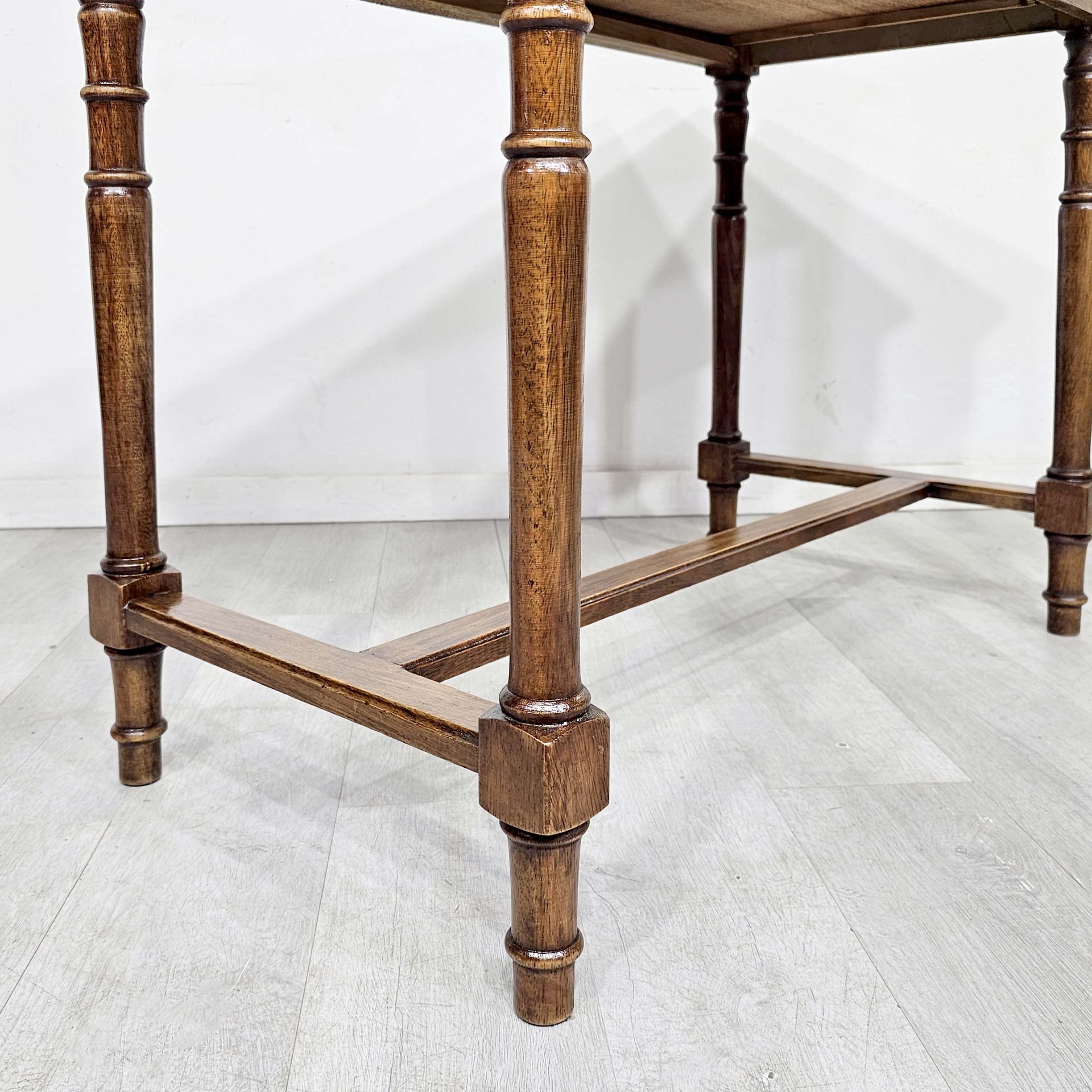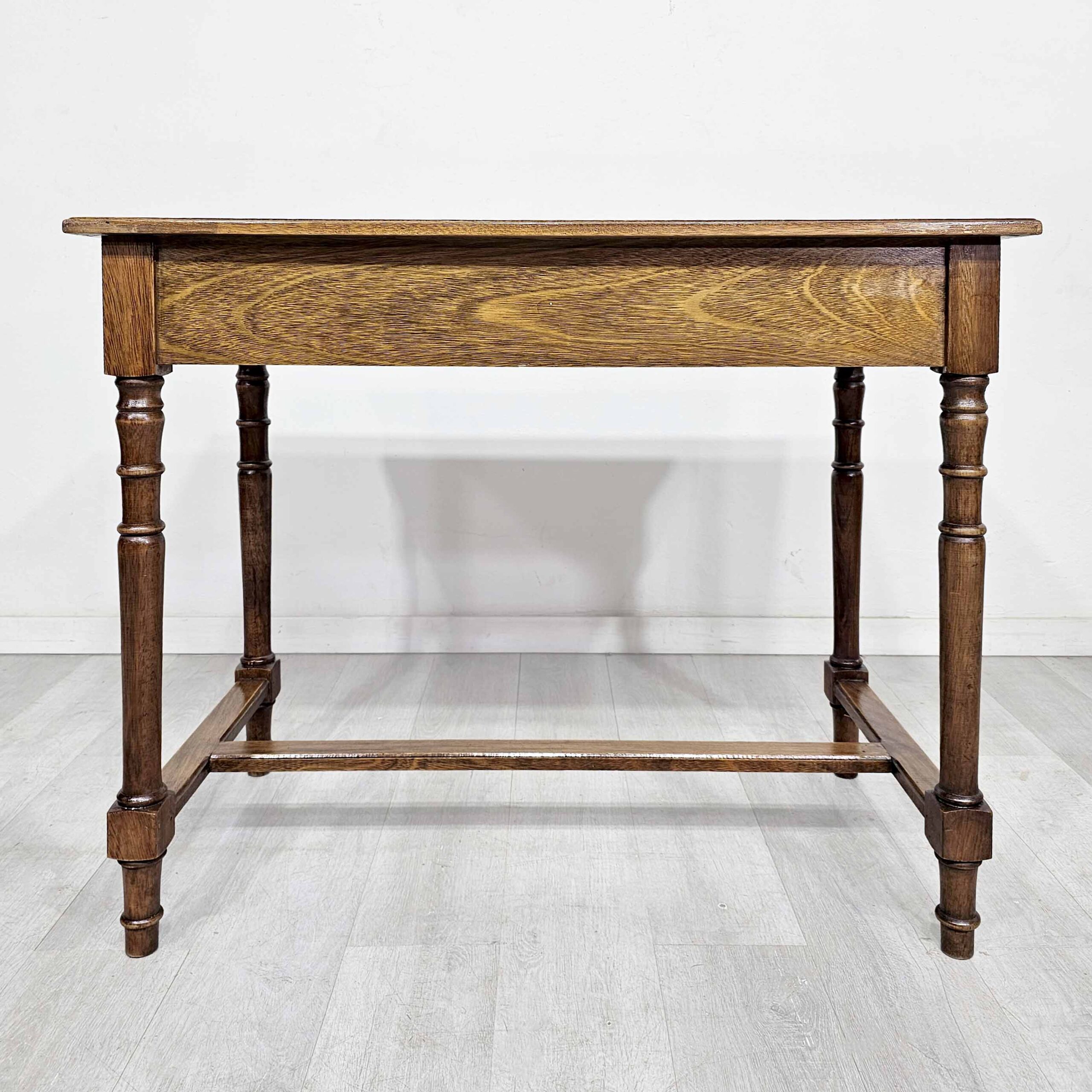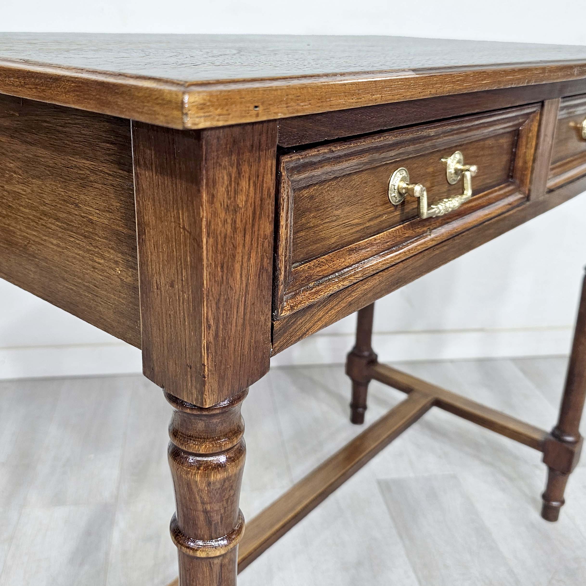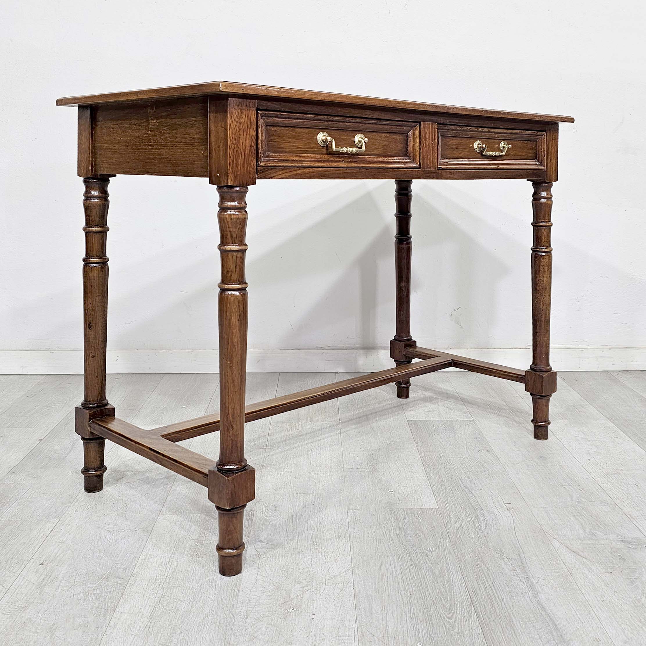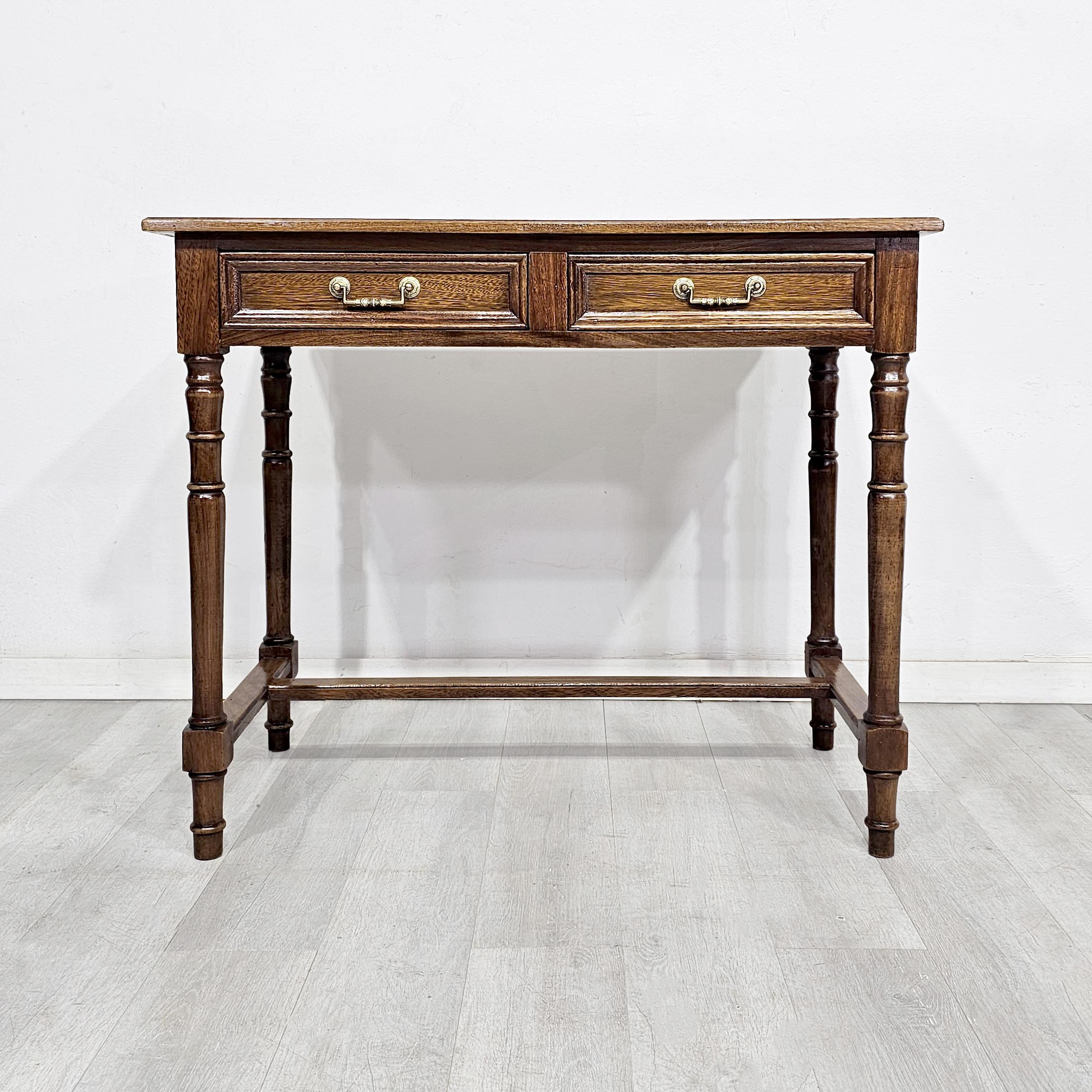 Escritorio chico de estilo inglés, realizado en madera de cerejeira, con patas torneadas y dos cajones frontales con herrajes de bronce. Un mueble clásico, liviano visualmente y muy funcional, ideal para home office, escritorio para notebook, mesa de trabajo o como consola en recibidor. Por su tamaño, es perfecto para espacios chicos sin perder presencia y calidad.