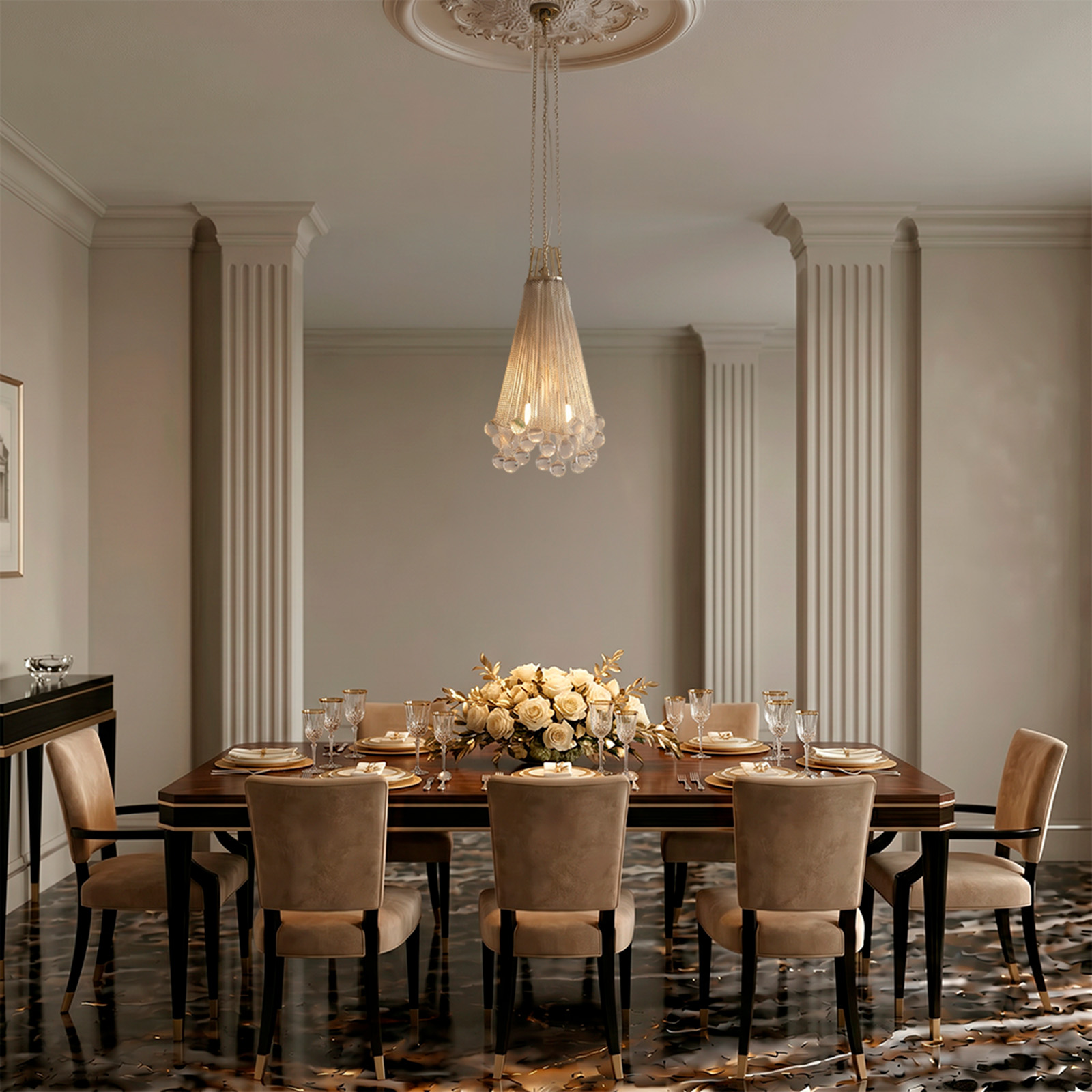 Su diseño combina la delicadeza de las guirnaldas de cristal con el volumen de las esferas de vidrio, logrando una estética refinada, luminosa y muy atractiva tanto apagada como encendida. Tiene un aire imperio reinterpretado, con impronta hollywood regency, que la vuelve muy versátil para ambientes clásicos, eclécticos o vintage.