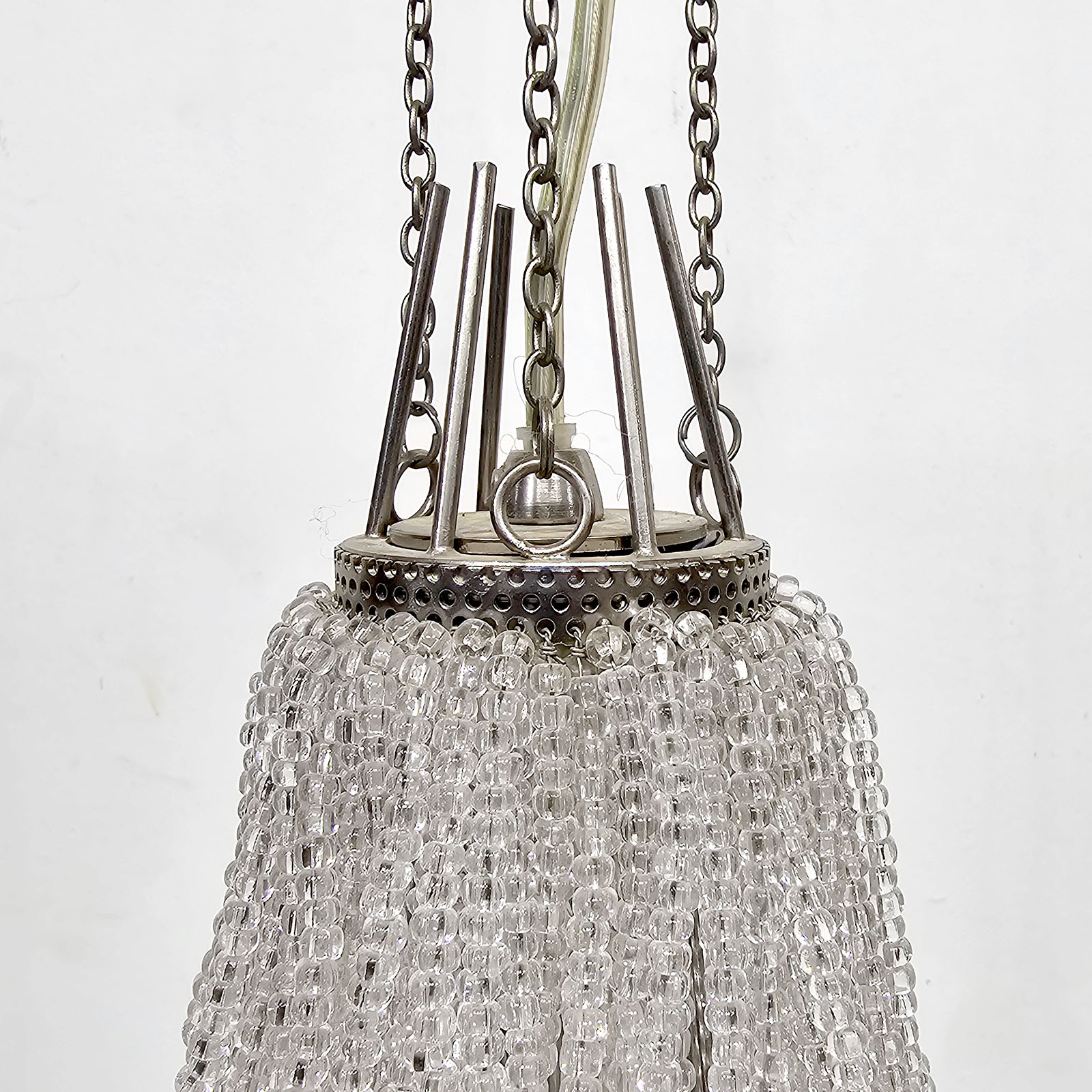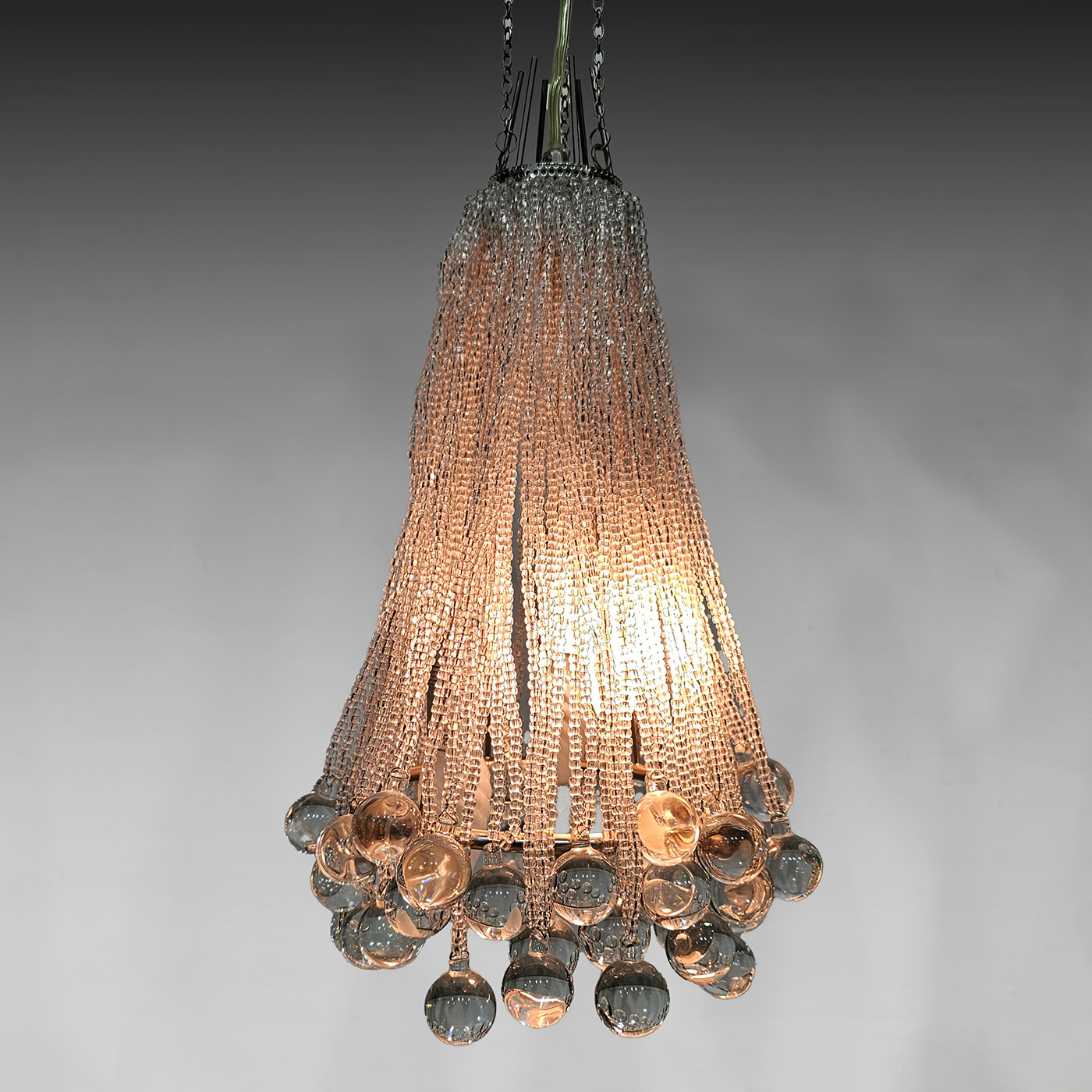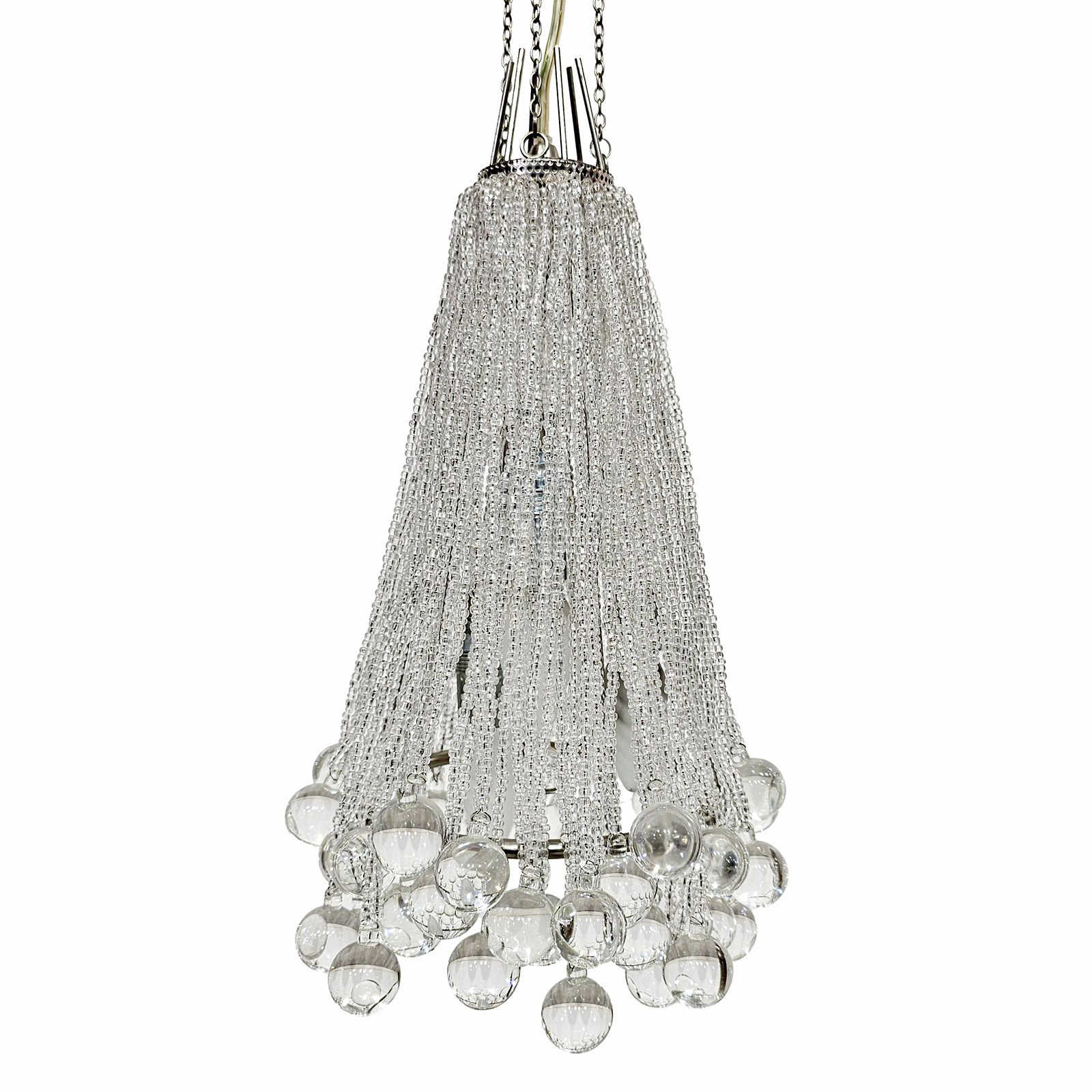 Lámpara colgante de techo realizada en metal, cuentas de cristal y esferas de vidrio transparente, con una caída elegante y muy decorativa. Es una pieza de gran efecto visual, ideal para sumar presencia en un hall, living, comedor o dormitorio.