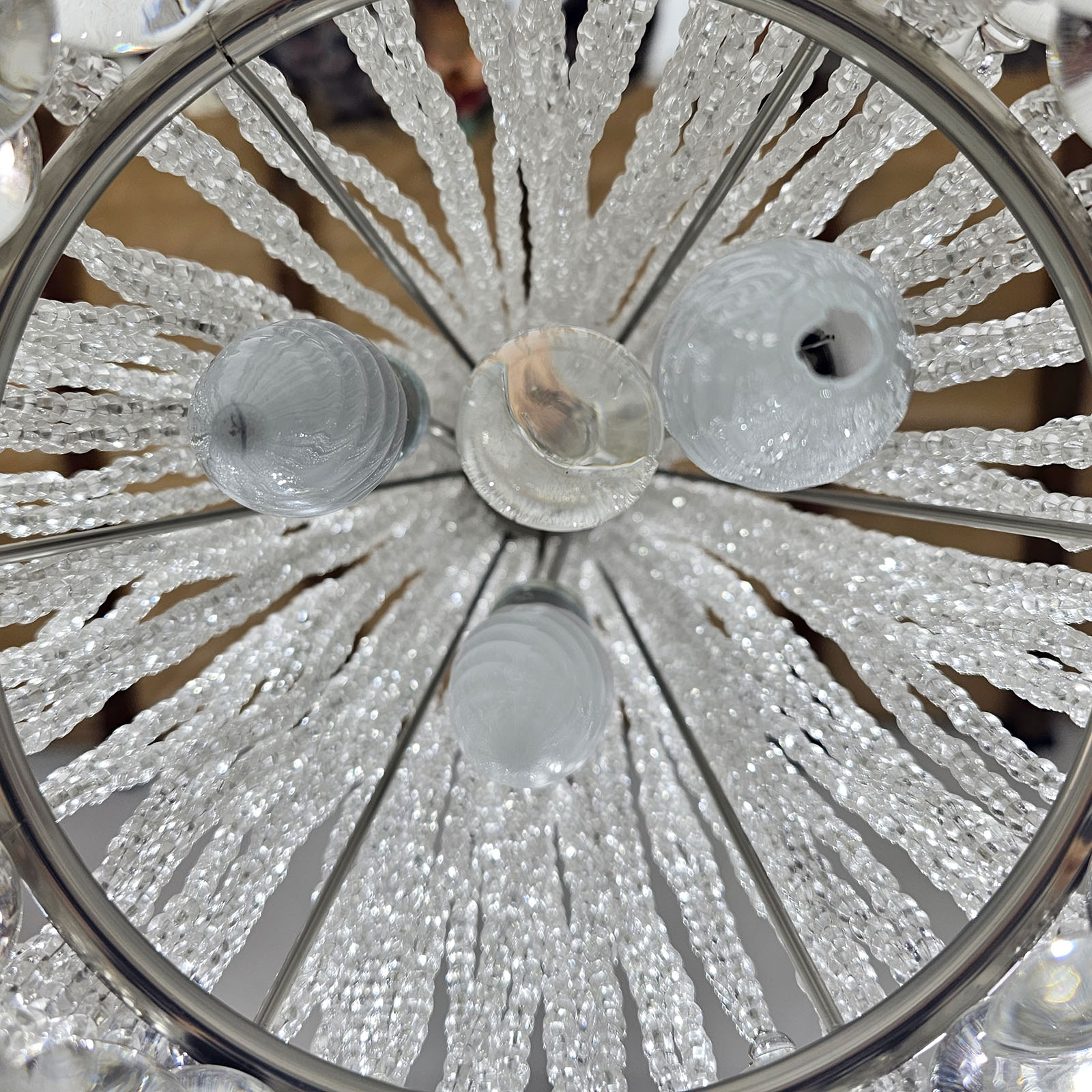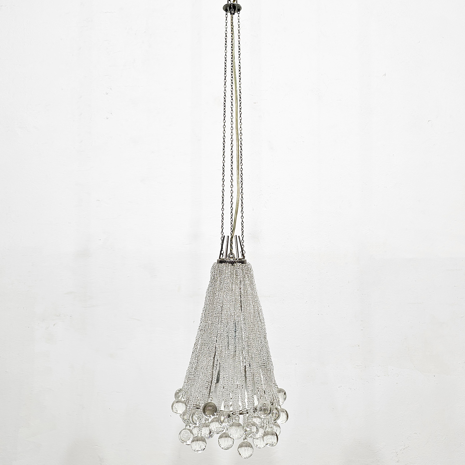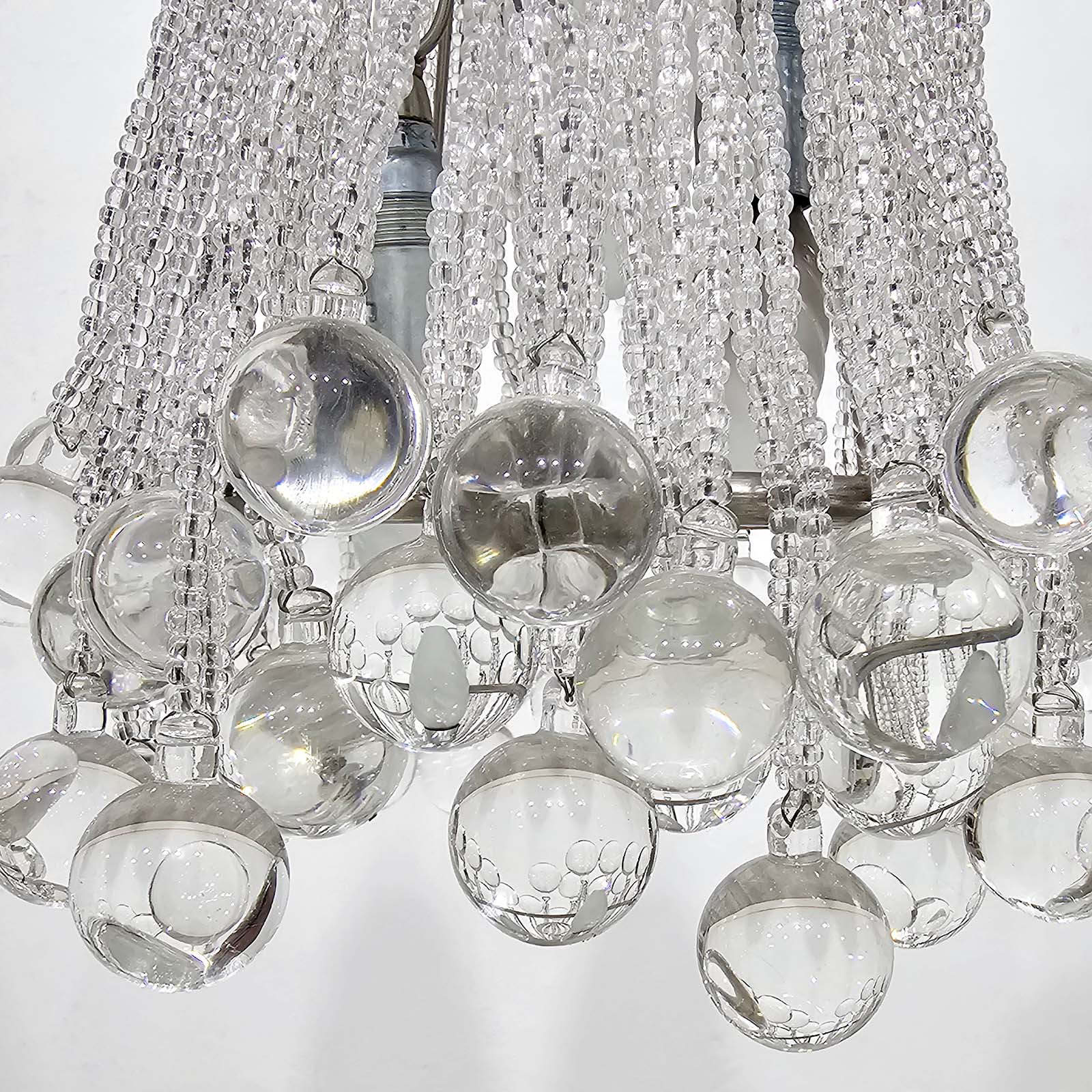 Lámpara colgante de techo realizada en metal, cuentas de cristal y esferas de vidrio transparente, con una caída elegante y muy decorativa. Es una pieza de gran efecto visual, ideal para sumar presencia en un hall, living, comedor o dormitorio.