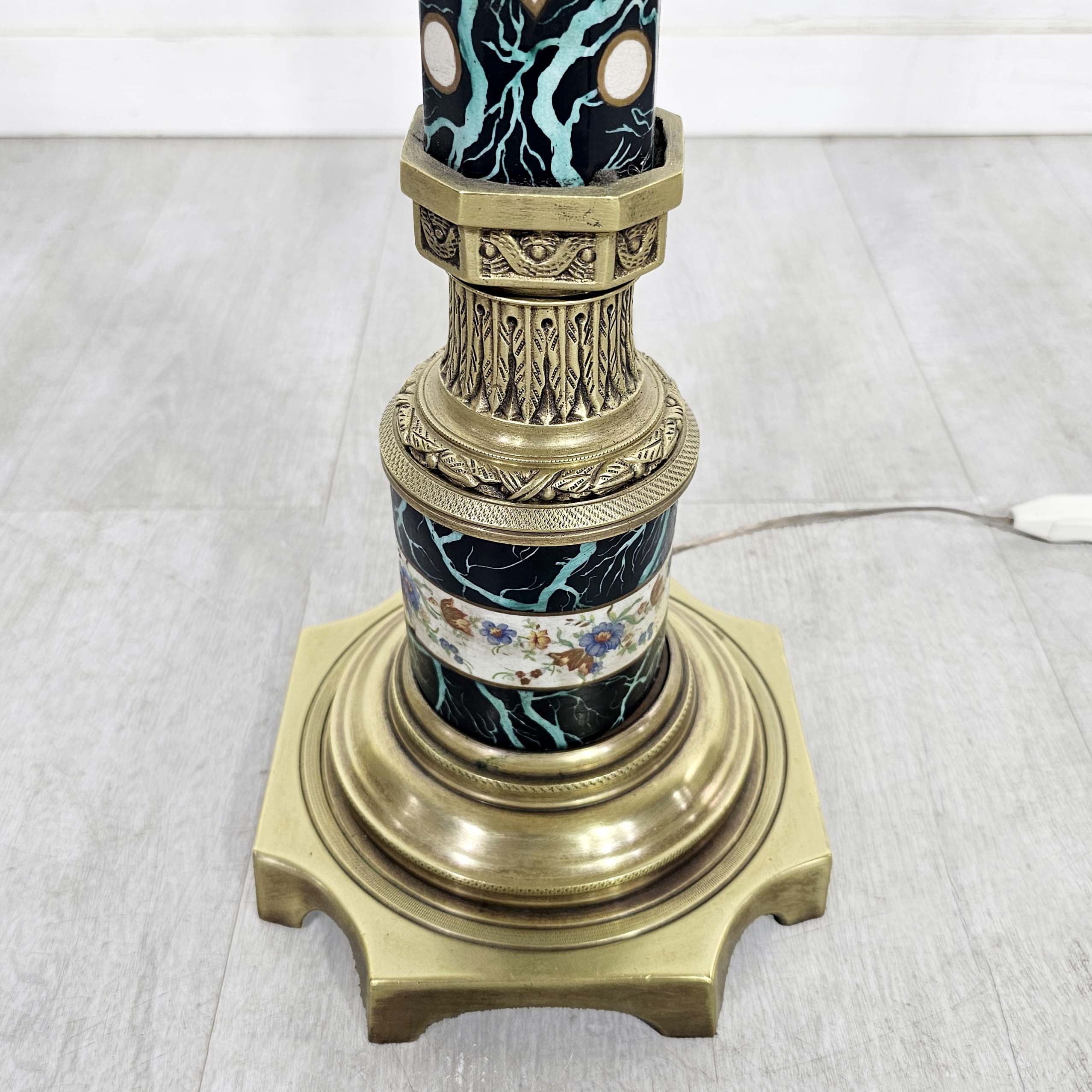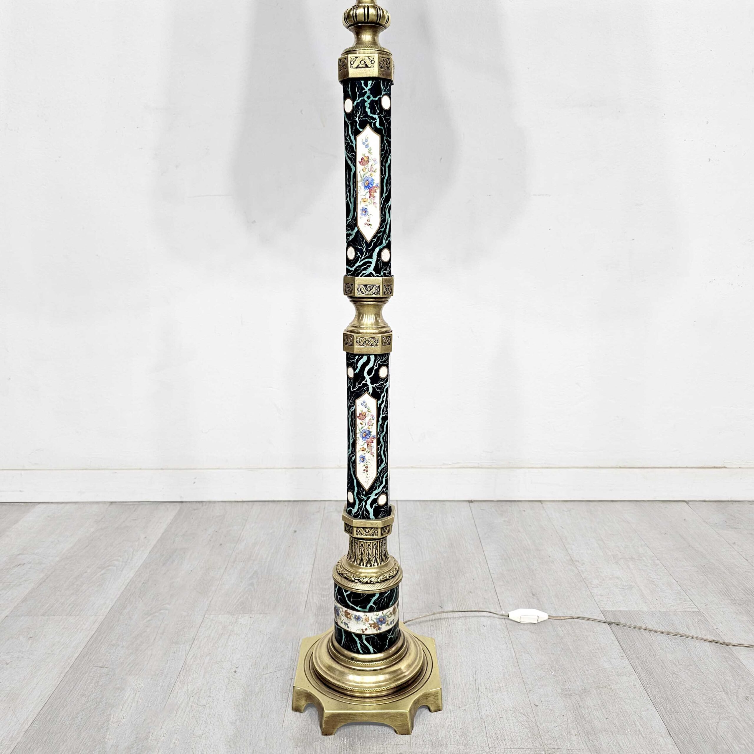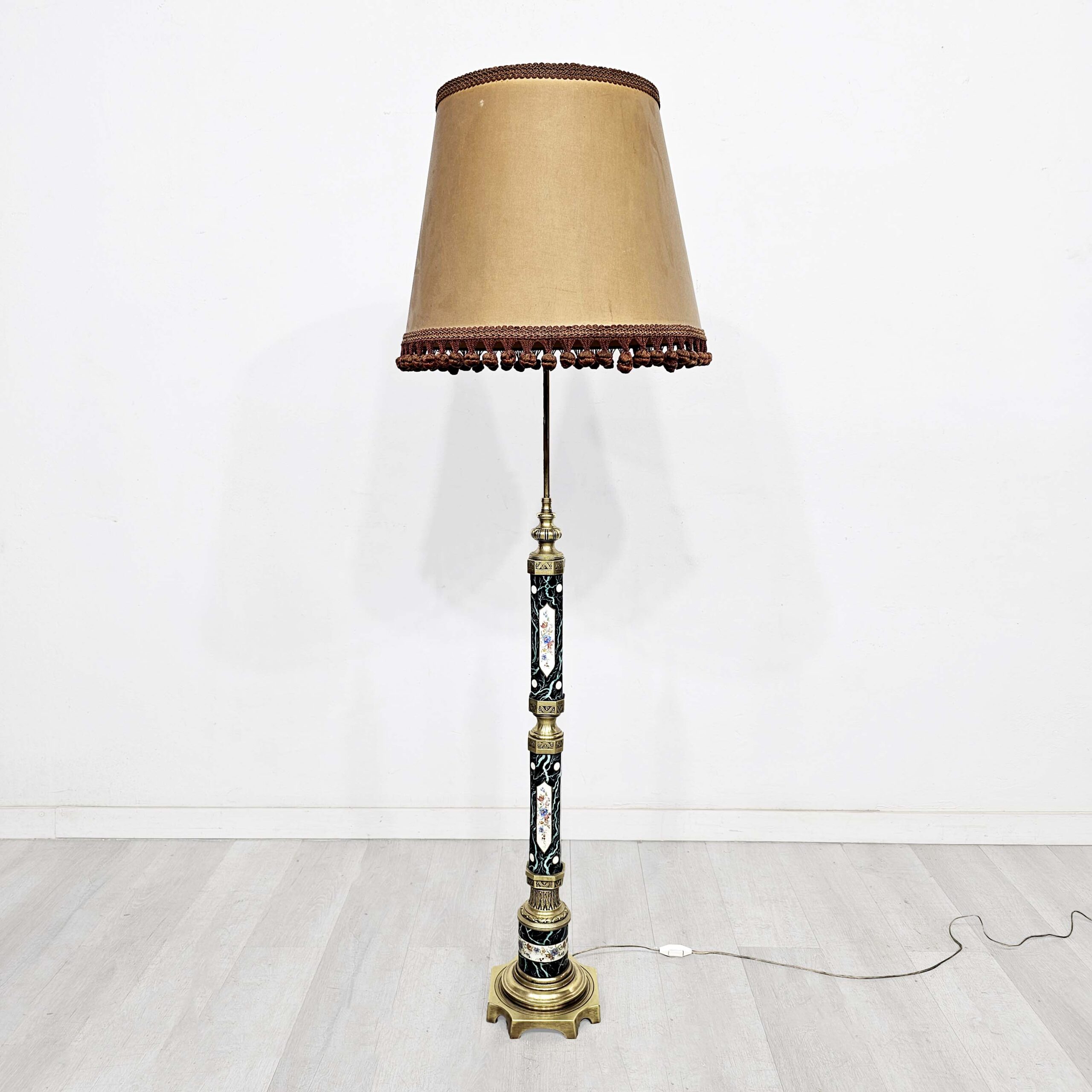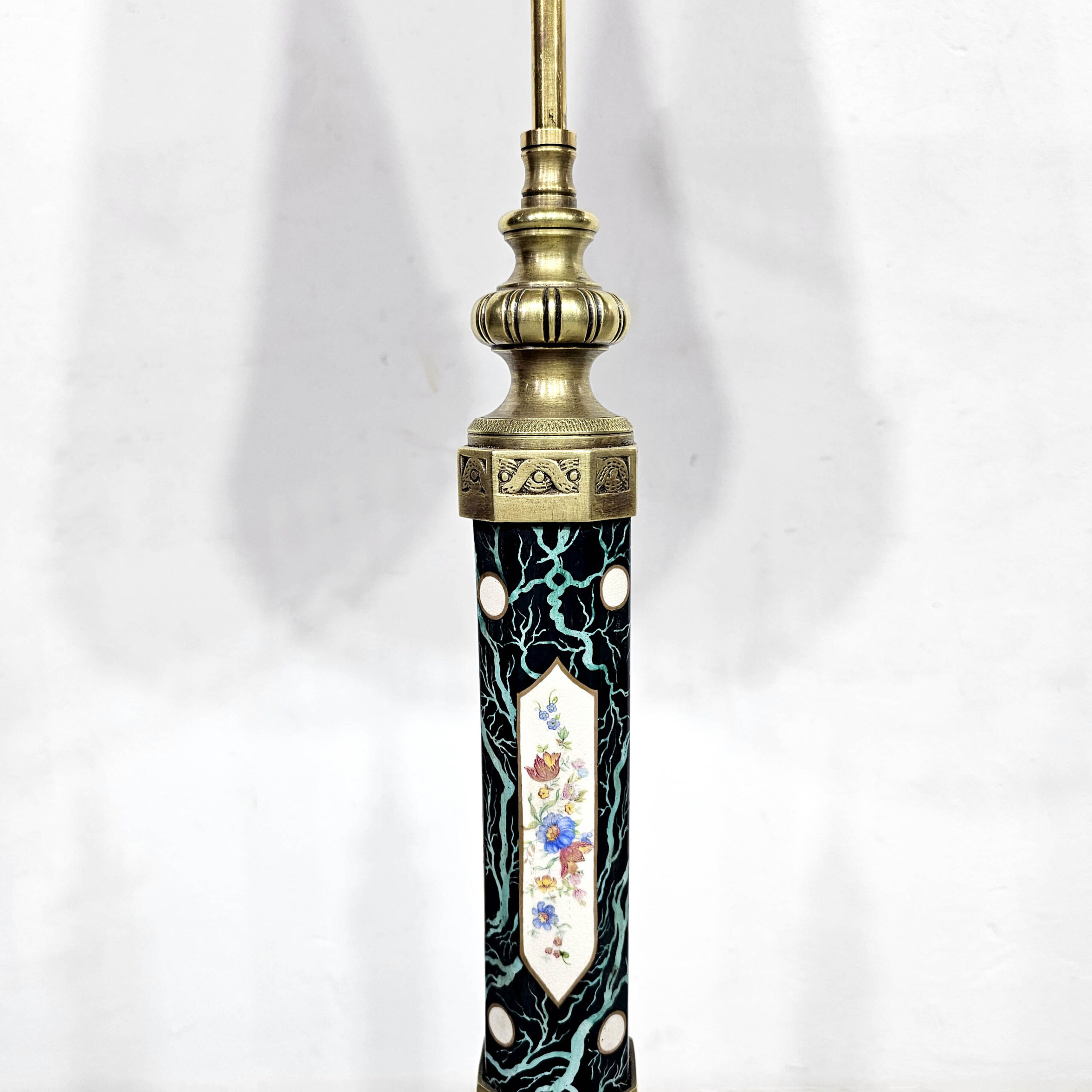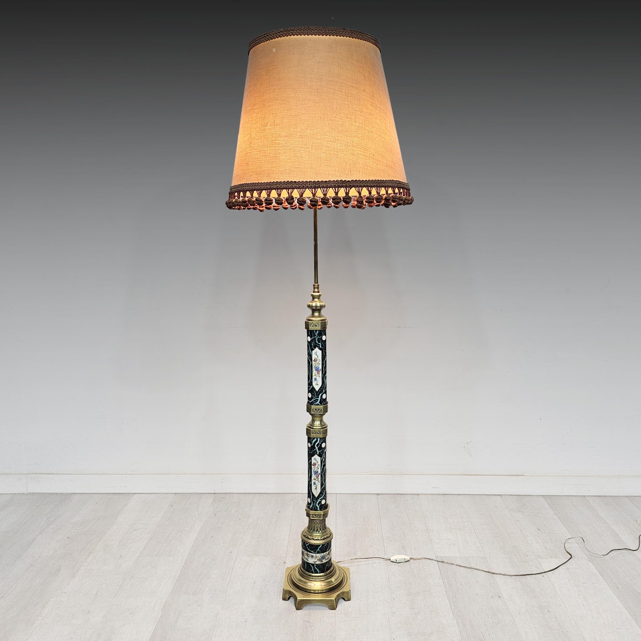 Pieza protagonista: lámpara de pie de gran porte, realizada en bronce con fuste facetado revestido en placas de porcelana decorativa, con detalles florales y fondo de efecto marmolado en tonos oscuros y turquesa. Se completa con pantalla textil troncocónica en tono camel con pasamanería inferior, aportando una presencia cálida, elegante y muy decorativa.