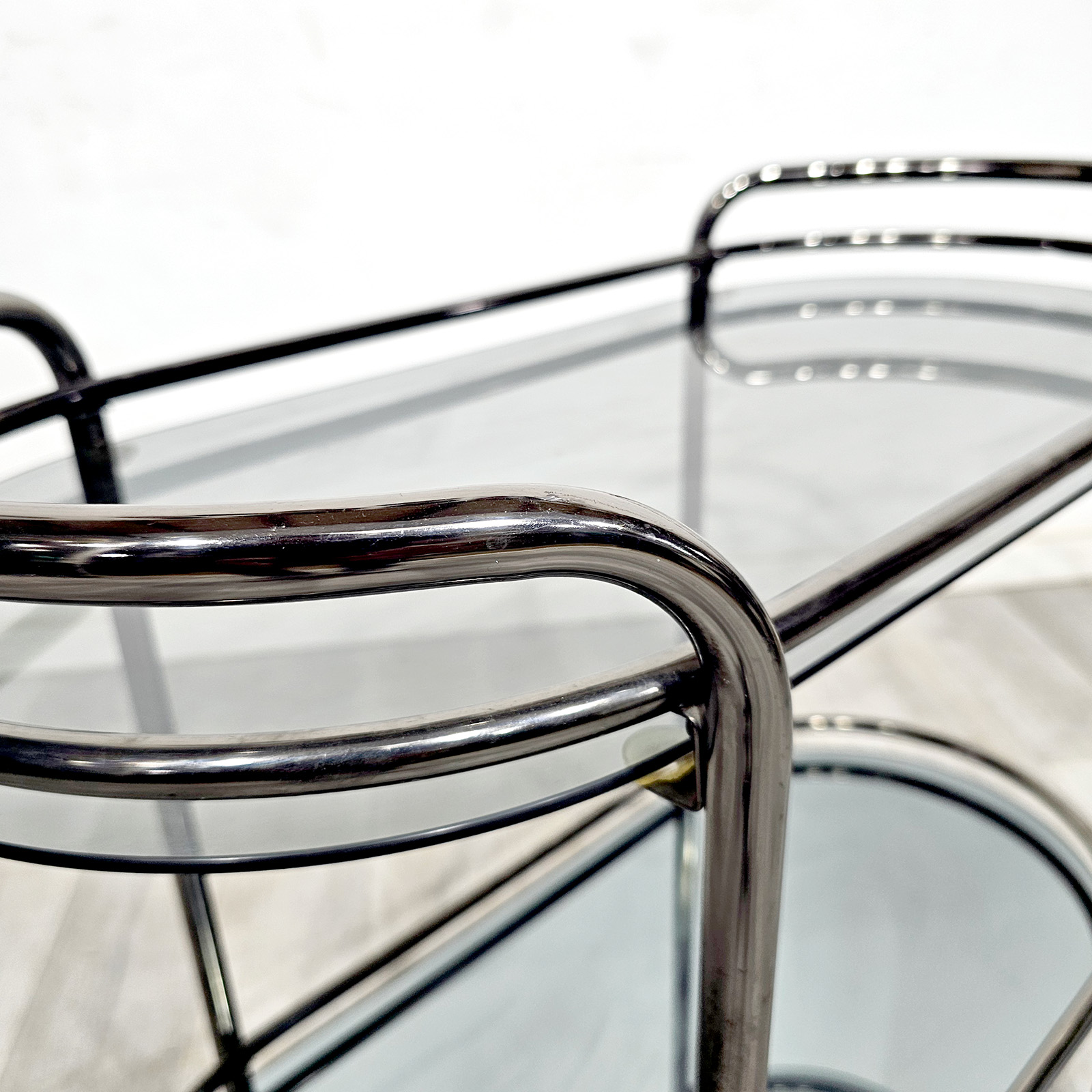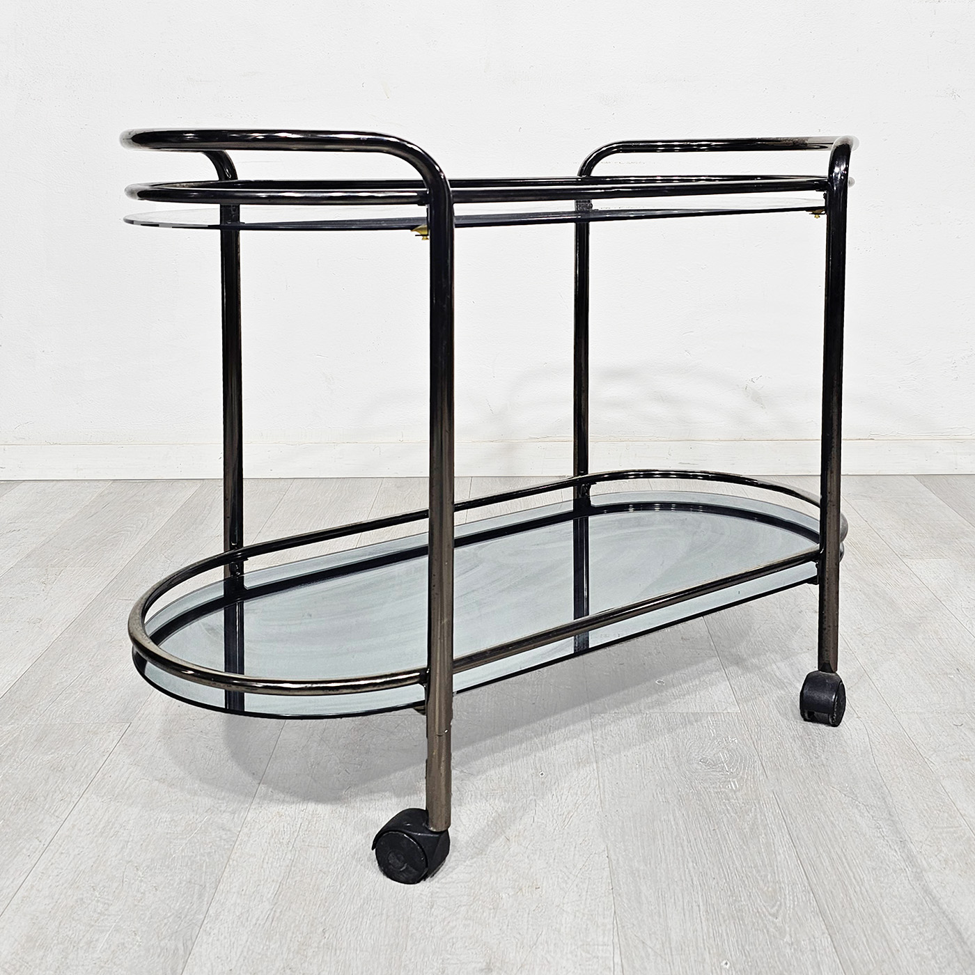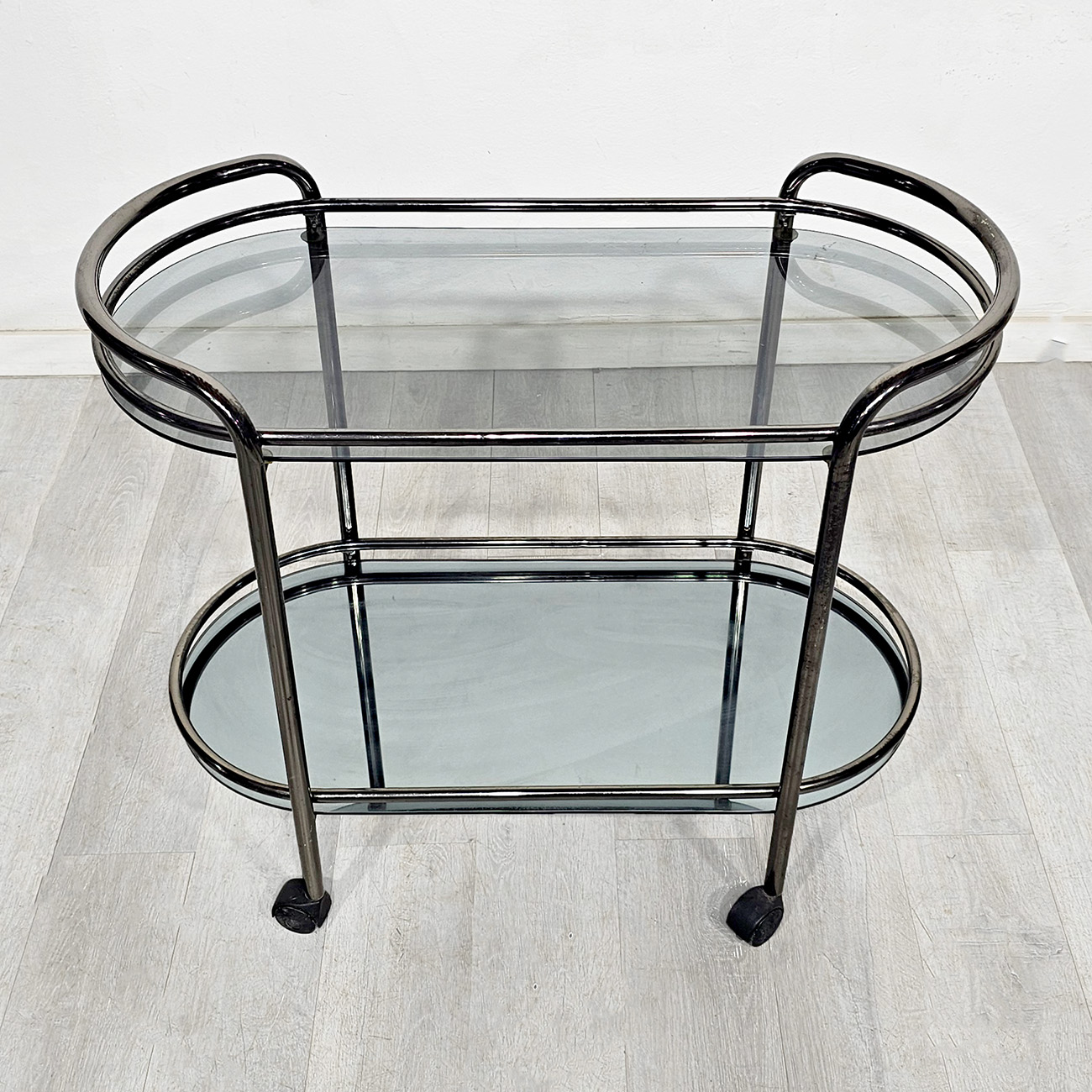 Carro bar vintage realizado en caño cromado oscuro, con tapa superior de vidrio fumé y estante inferior en espejo fumé. De formato ovalado y con ruedas, resulta ideal como mesa auxiliar rodante o apoyo bar. Medidas: 80 x 40 x 68 cm. Espacio entre planos: 44 cm.