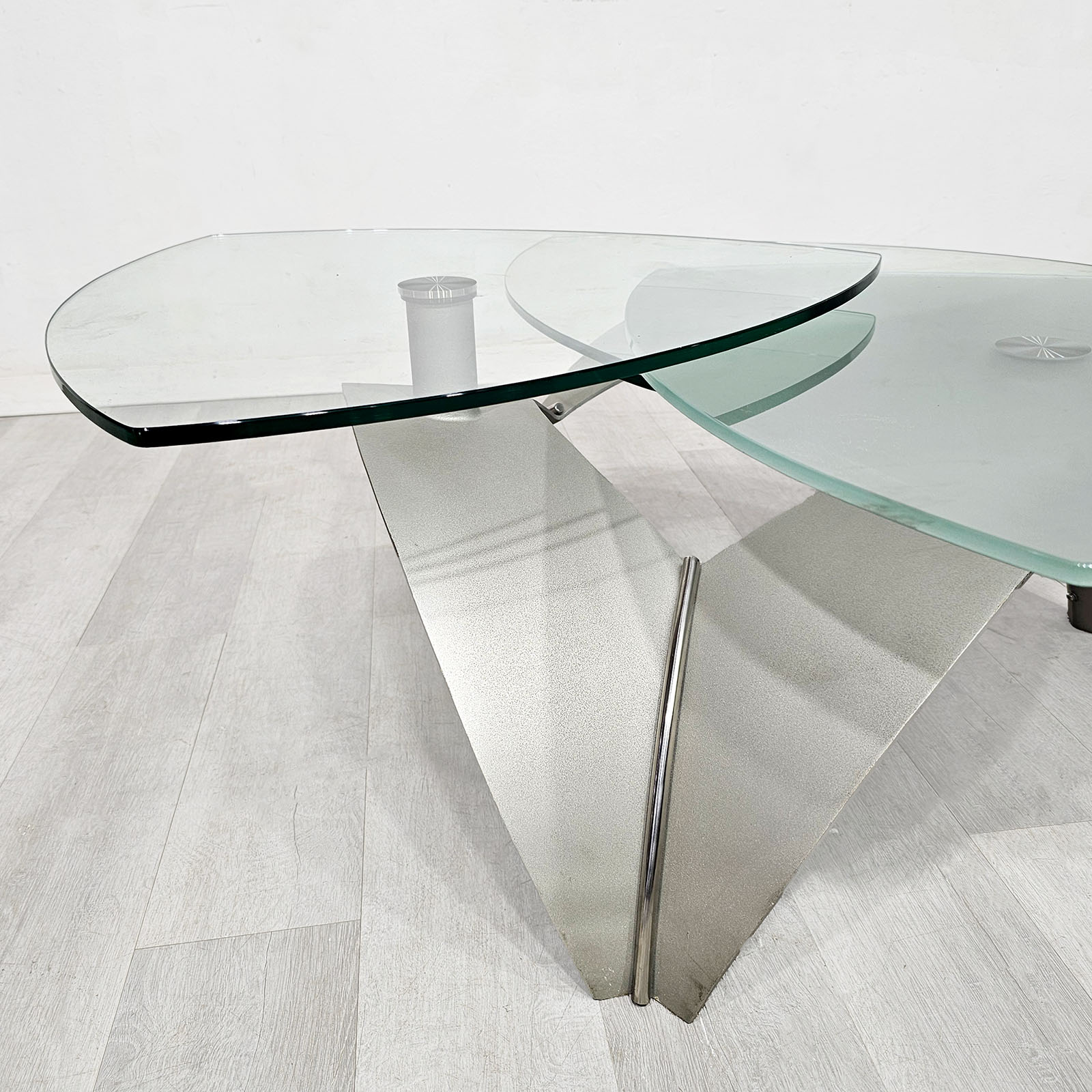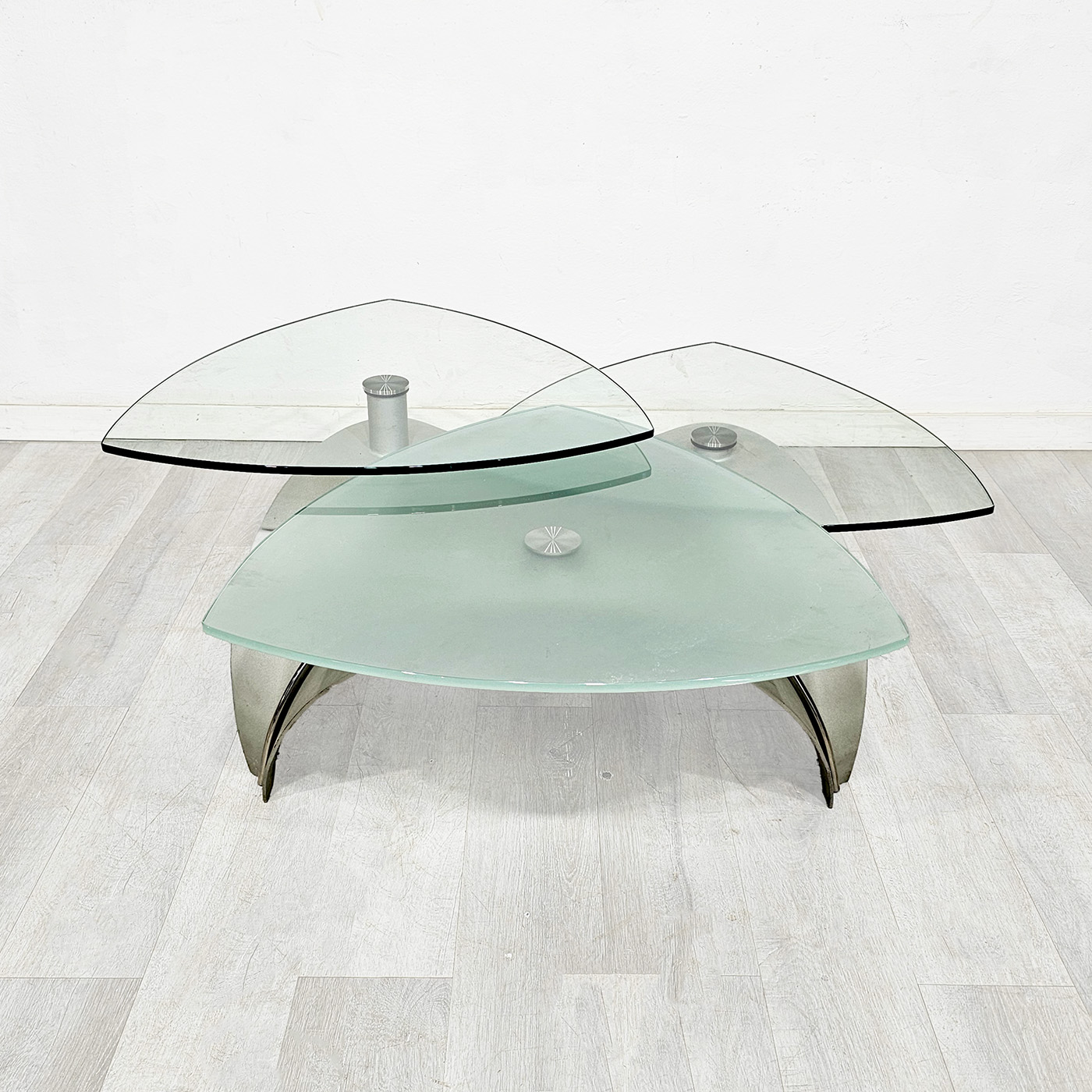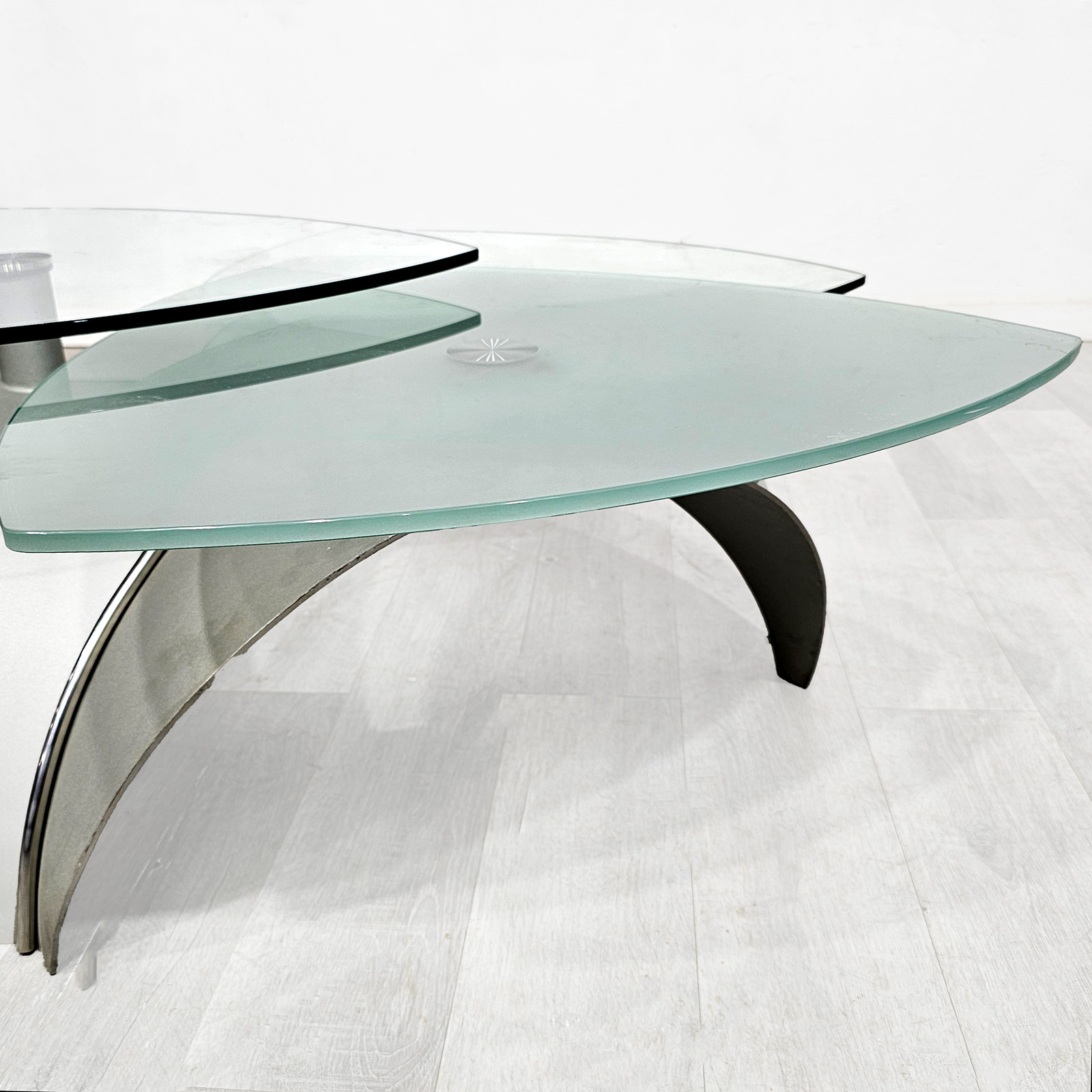 Mesa ratona de diseño contemporáneo con 3 tapas de vidrio templado, giratorias y desmontables, sobre base de acero inoxidable. Una pieza moderna, escultórica y funcional, ideal para living. Alto: 41 cm. Diámetro total aprox.: 115 cm. Cada vidrio aprox.: 65 cm.