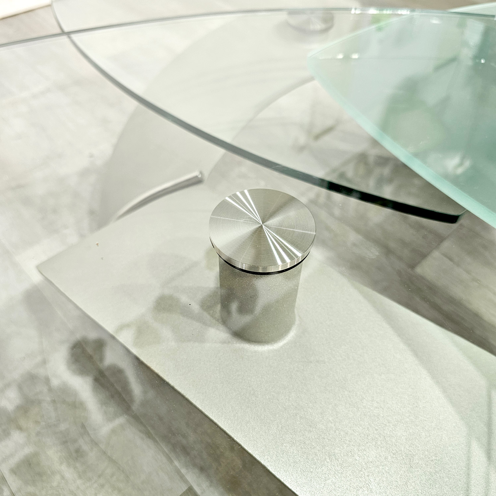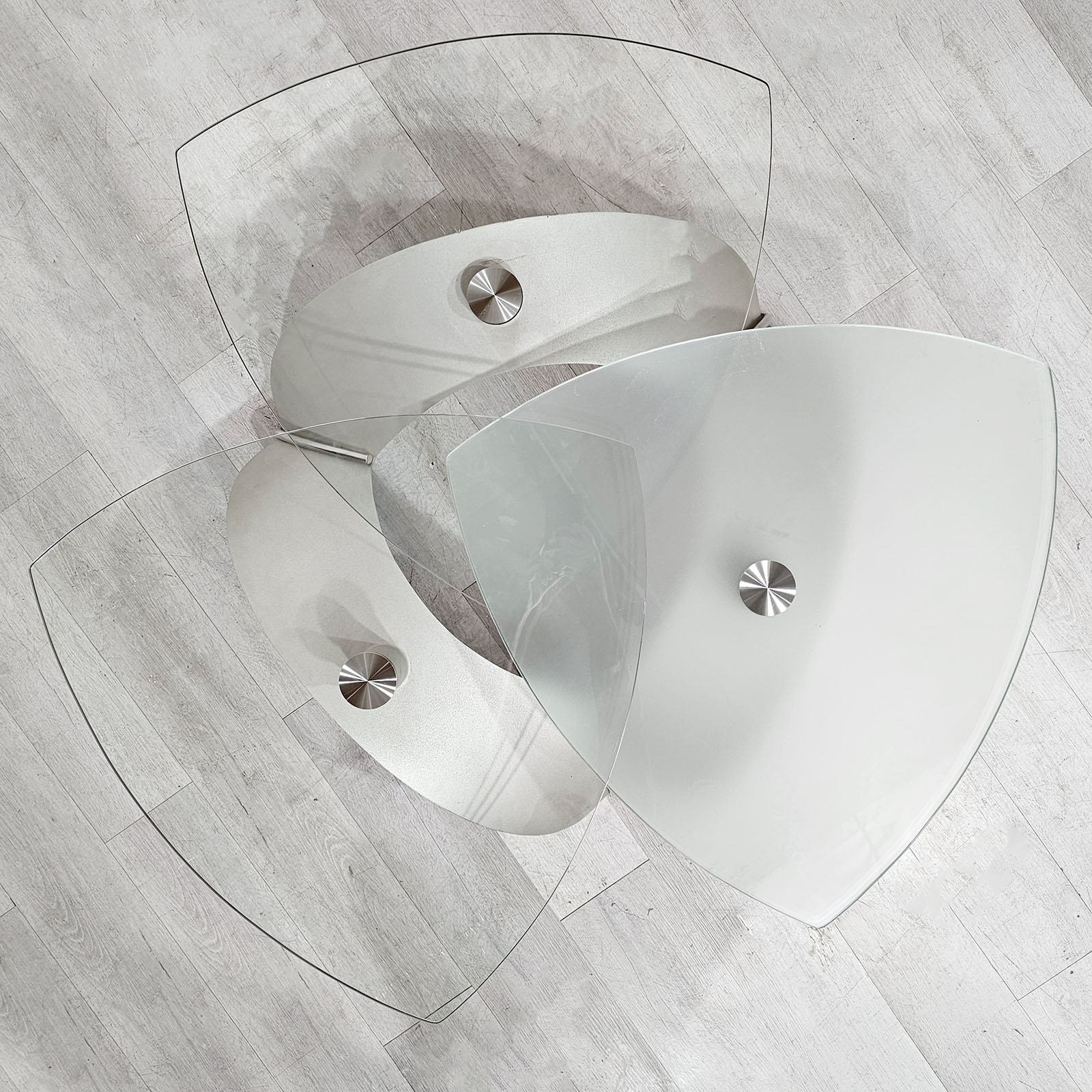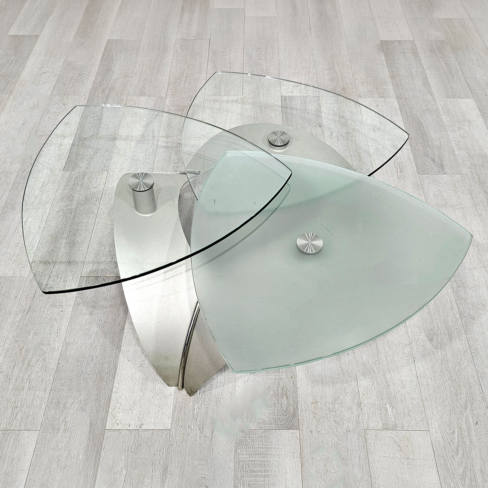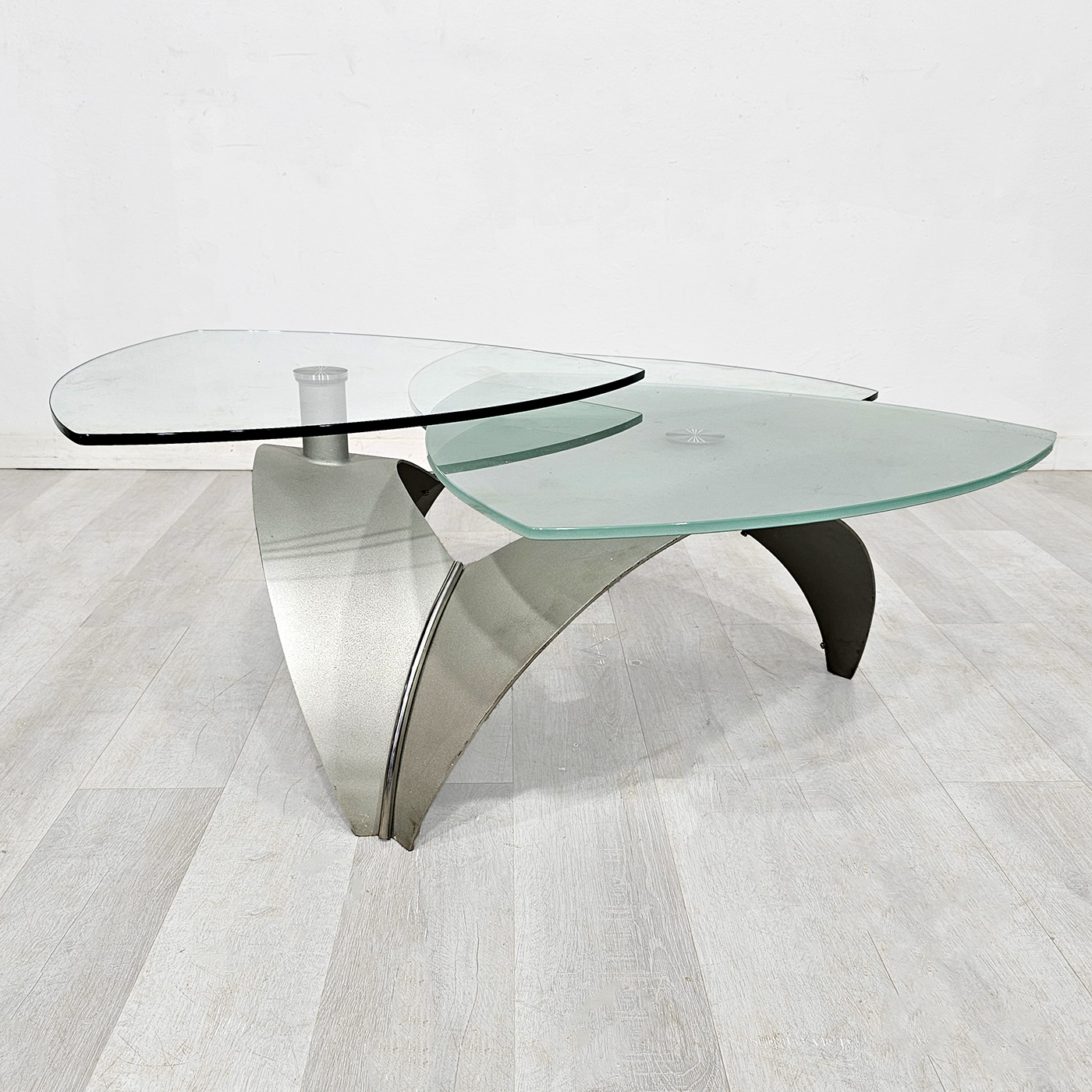 Mesa ratona de diseño contemporáneo con 3 tapas de vidrio templado, giratorias y desmontables, sobre base de acero inoxidable. Una pieza moderna, escultórica y funcional, ideal para living. Alto: 41 cm. Diámetro total aprox.: 115 cm. Cada vidrio aprox.: 65 cm.