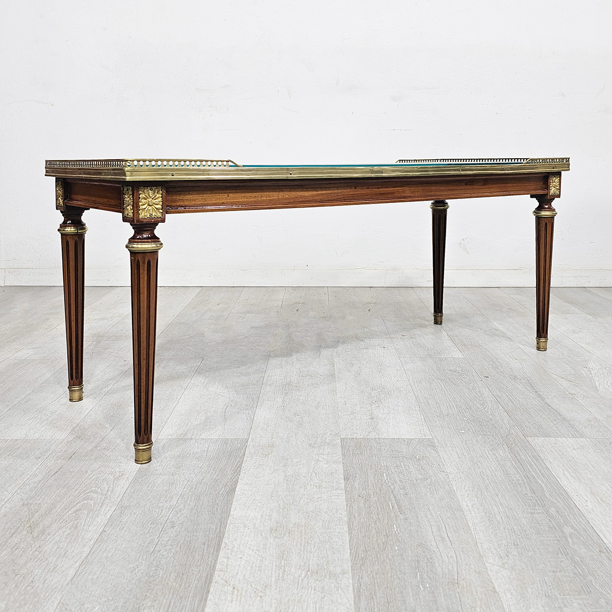 Mesa ratona de estilo francés Luis XVI, realizada en cedro y enchapada en raíz de nogal, con tapa de vidrio, galería perimetral de bronce, aplicaciones decorativas y patas acanaladas con punteras. Pieza clásica, elegante y muy decorativa, ideal para living o recepción