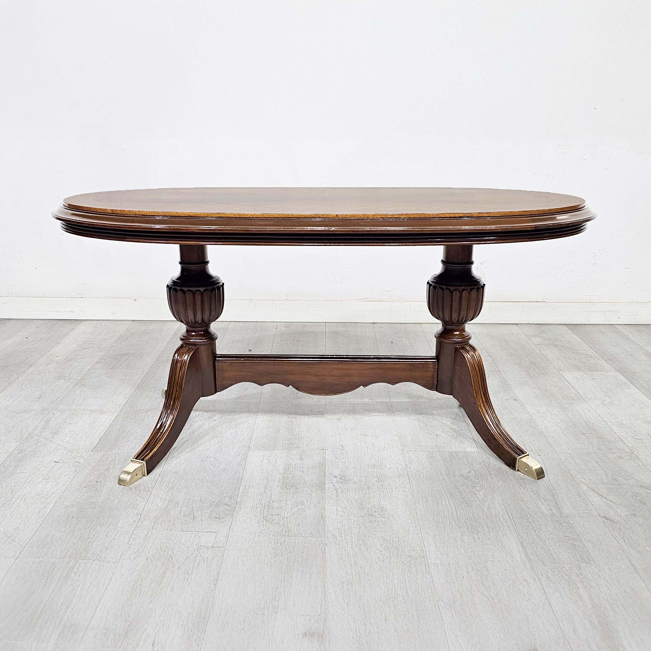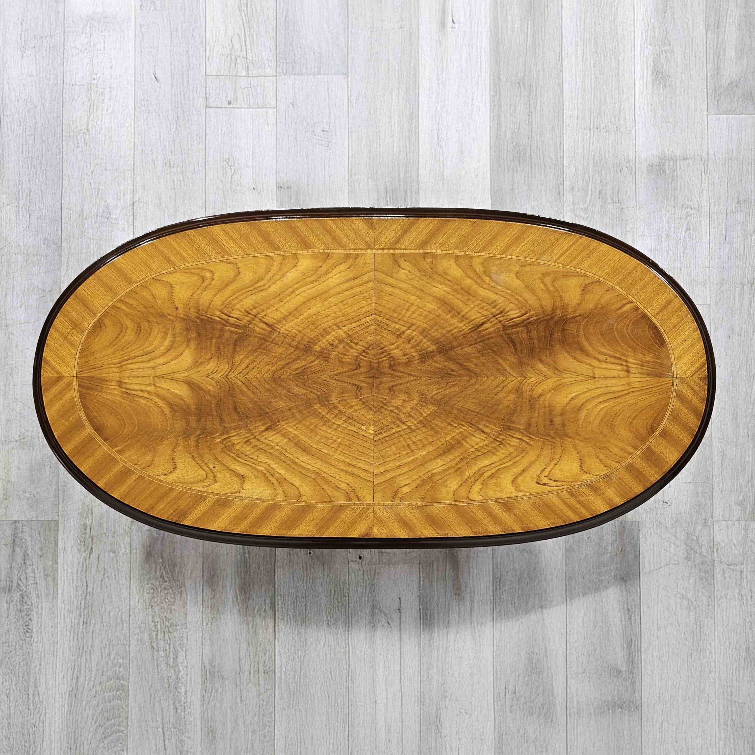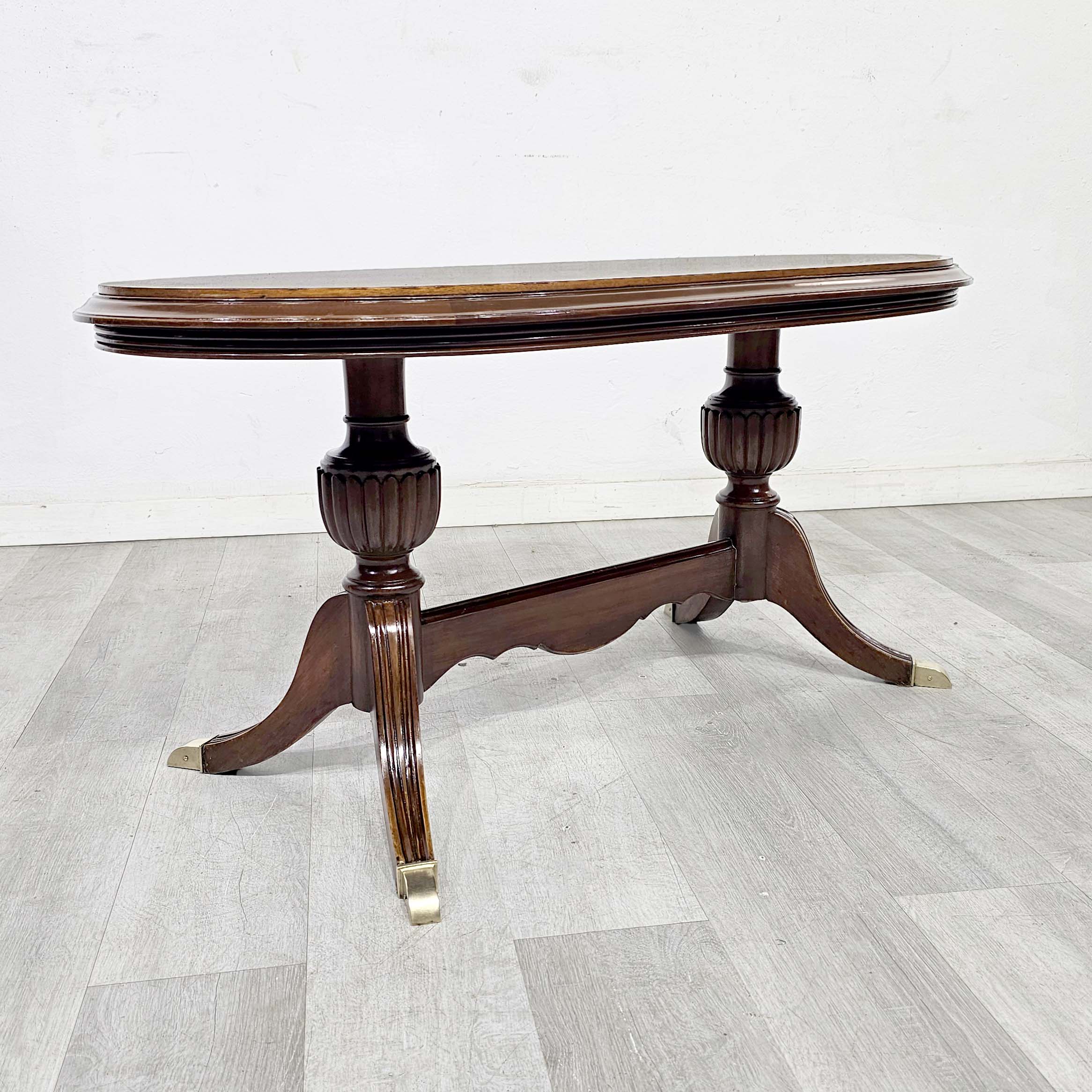 Mesa ratona oval estilo inglés en cedro con tapa enchapada en pluma de caoba (veta espejada), base de doble pedestal y patas curvas con regatones metálicos. Ideal para living o sala de estar.