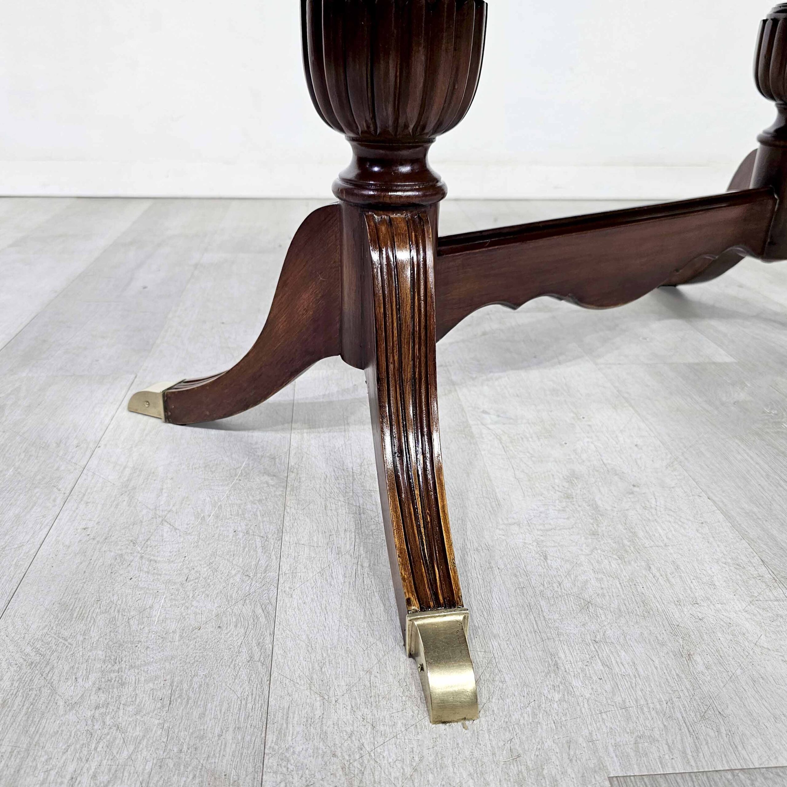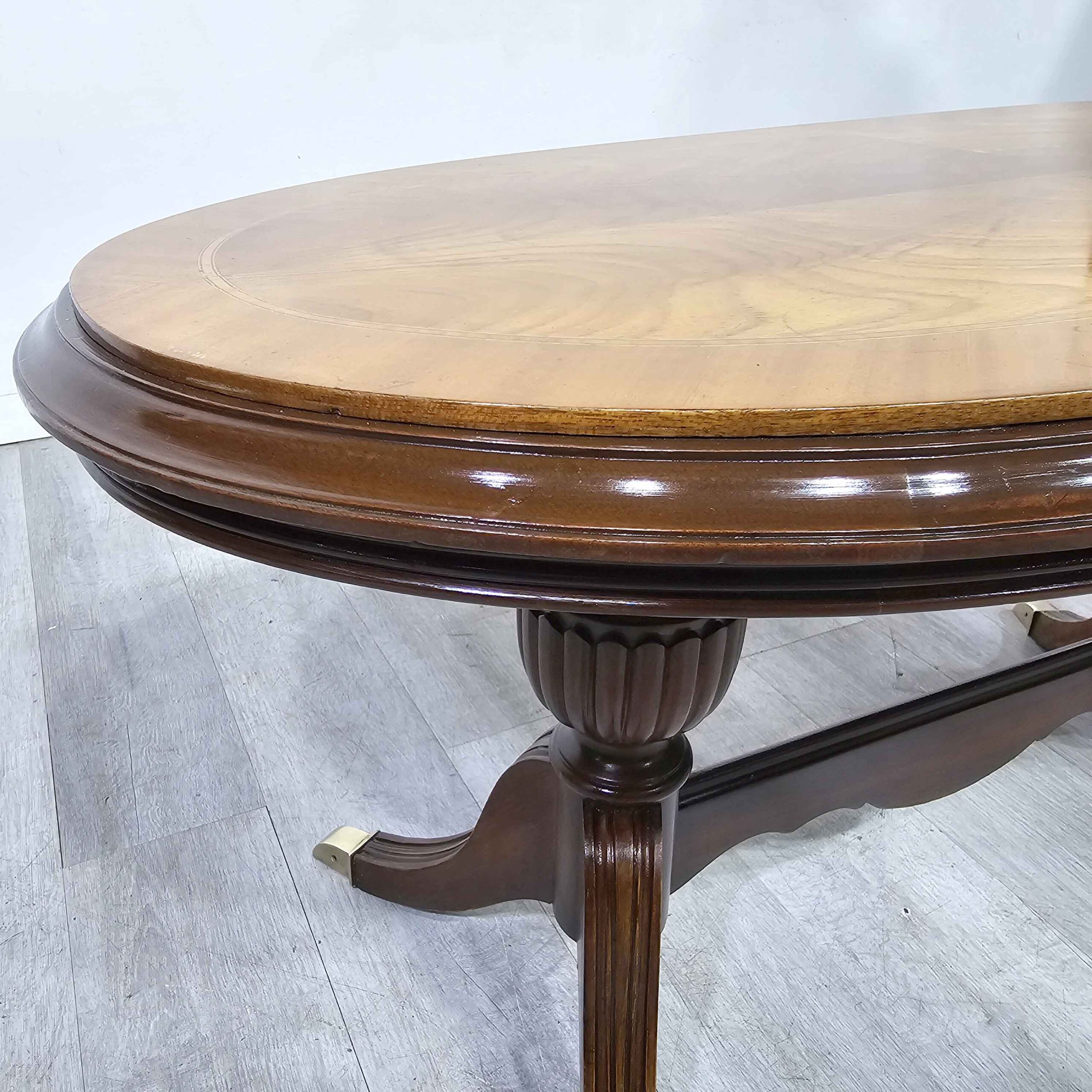 Mesa ratona oval de estilo clásico inglés, realizada en cedro con tapa enchapada en pluma de caoba (veta espejada) y elegante moldura perimetral. Presenta base con doble pedestal torneado y patas curvas, con regatones de bronce en los apoyos. Una pieza fina y atemporal, ideal para living, sala de estar o recibidor: aporta presencia y calidez, combinando perfecto con sillones clásicos o deco contemporánea.