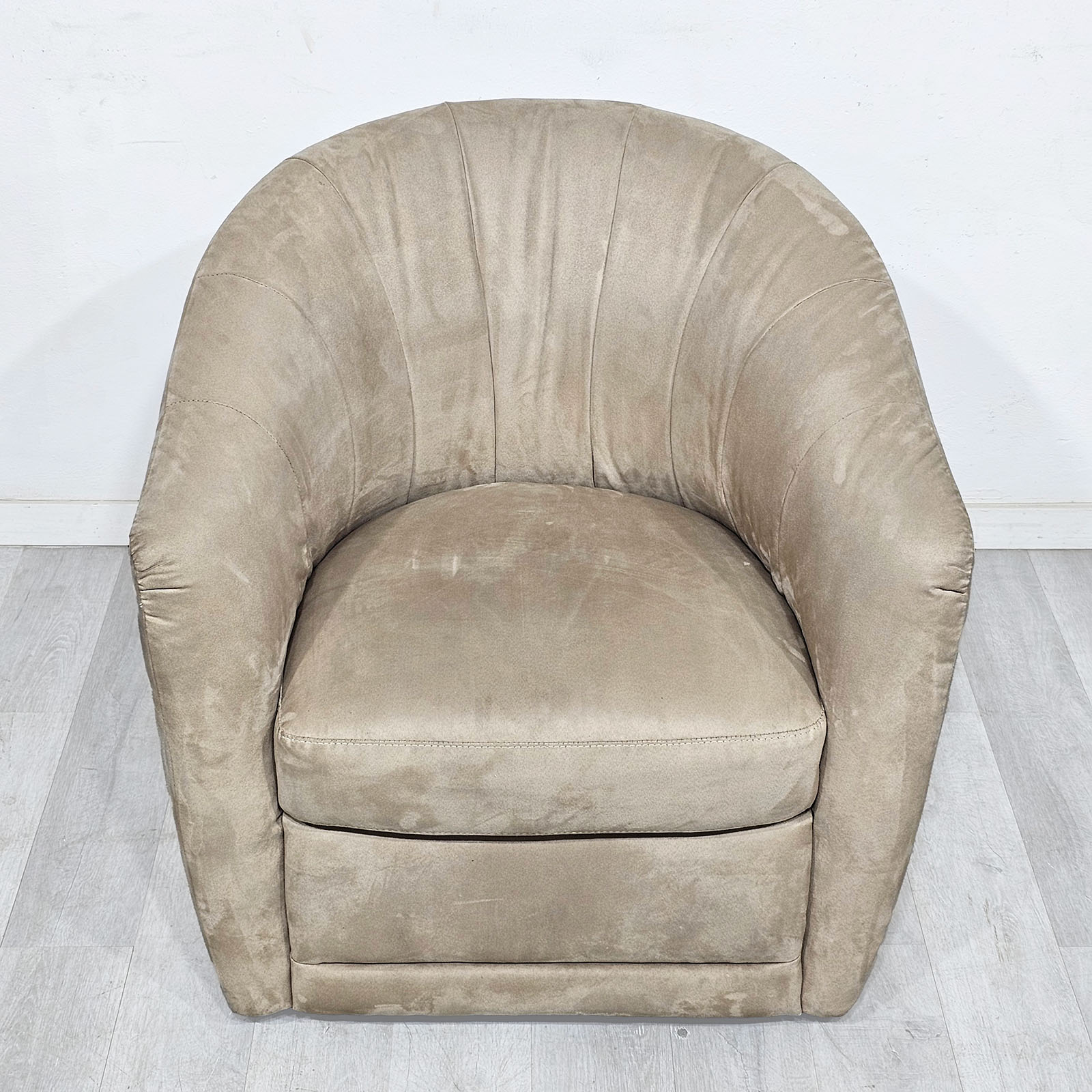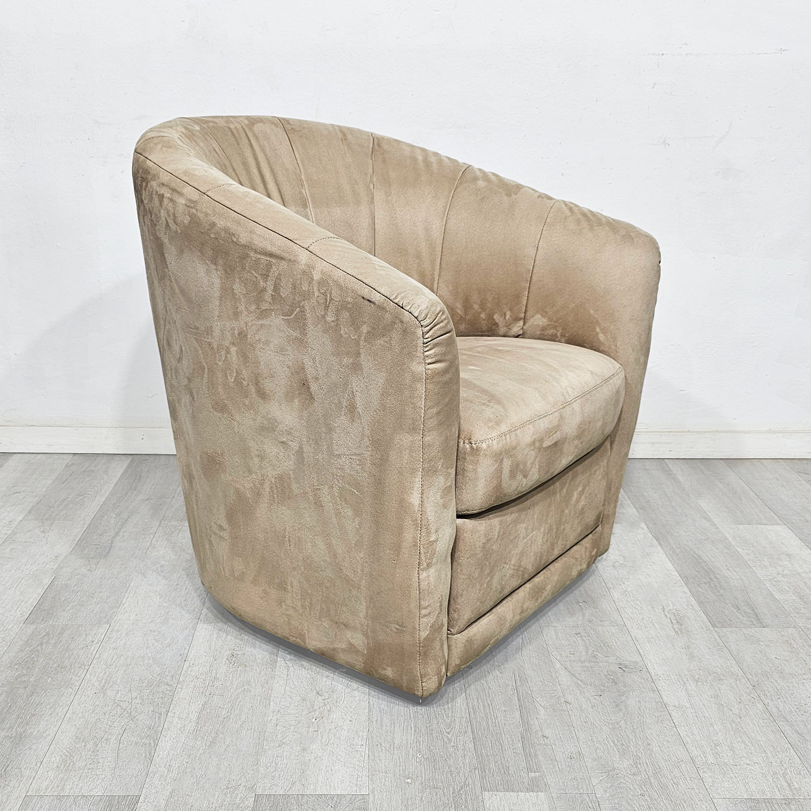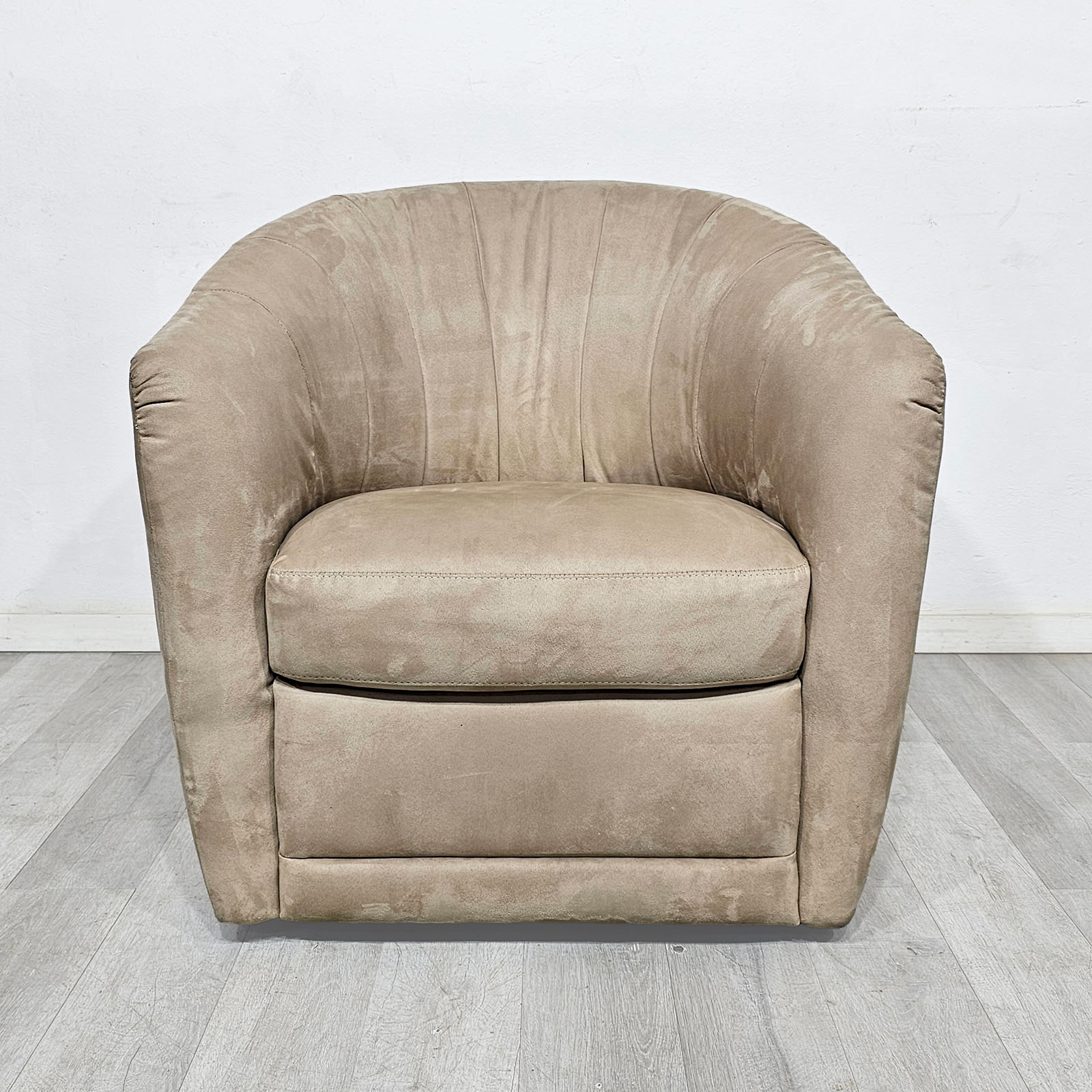 Sillón giratorio Natuzzi Italsofa, línea Capri, tapizado en pana color beige arena. De diseño curvo y envolvente, cómodo y elegante, ideal para living, dormitorio o rincón de lectura. Medidas: 82 x 80 x 80 cm. Alto de asiento: 45 cm.