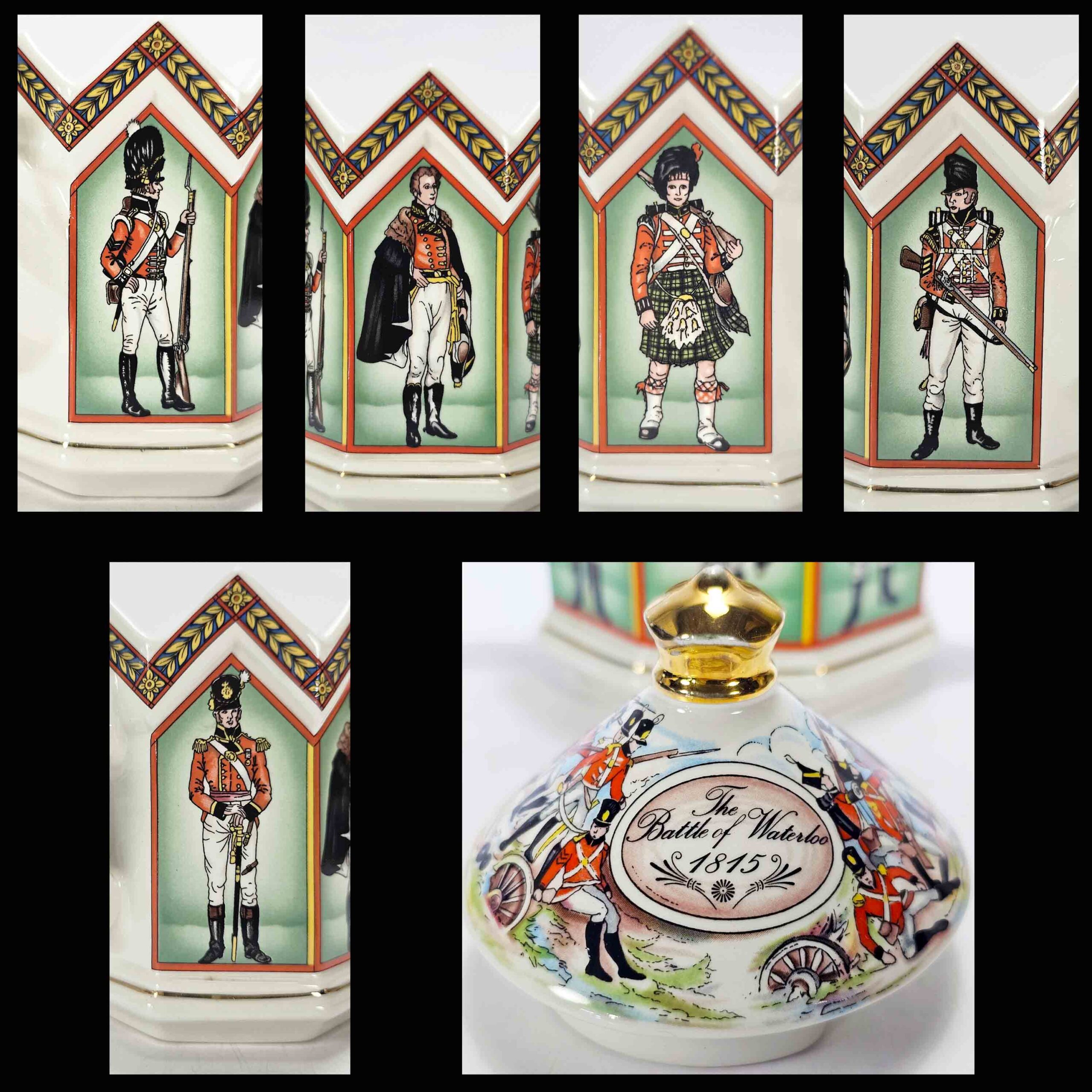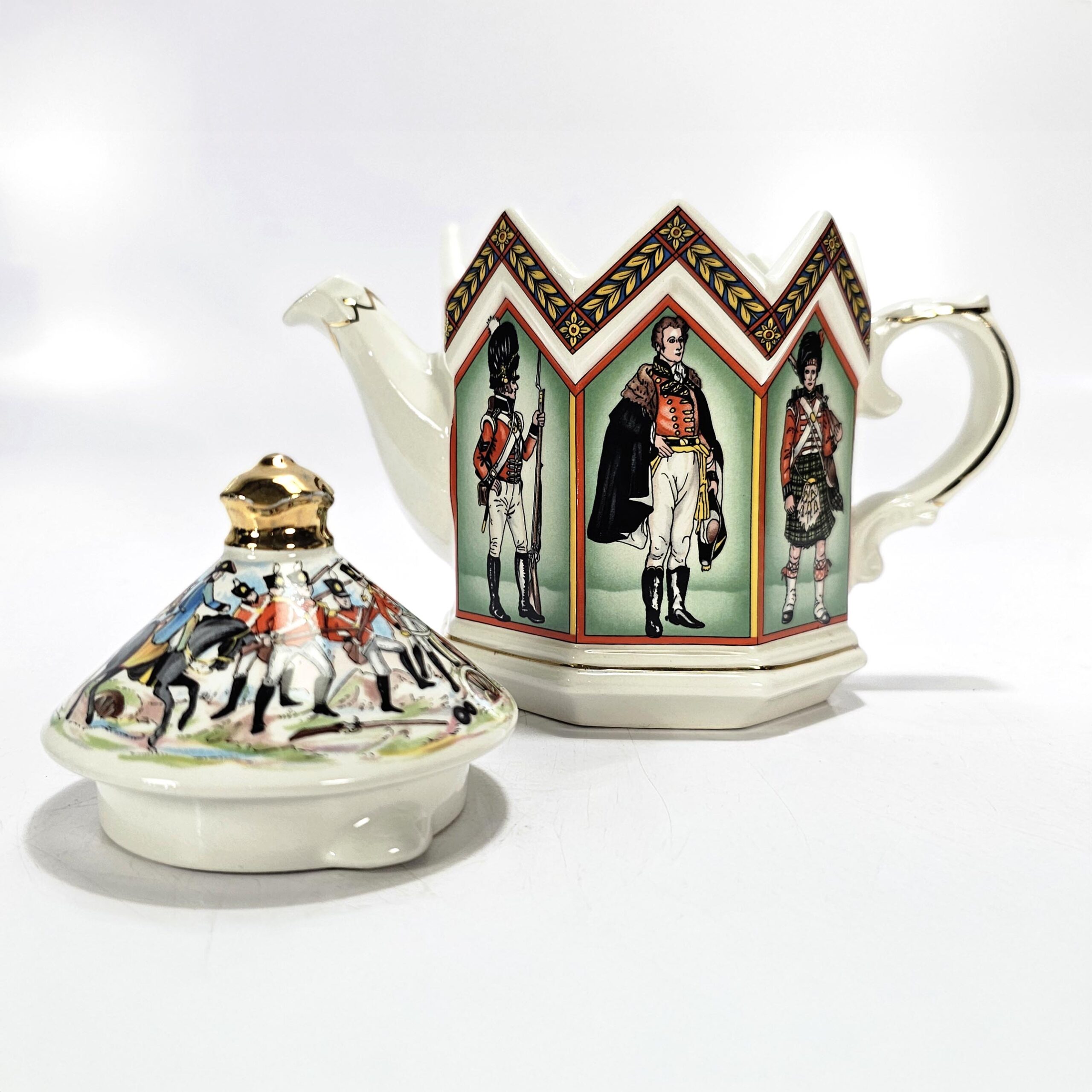 Bellísima tetera inglesa de colección, marca Sadler, modelo conmemorativo de la Batalla de Waterloo (1815), con representaciones de uniformes militares británicos de la época napoleónica.